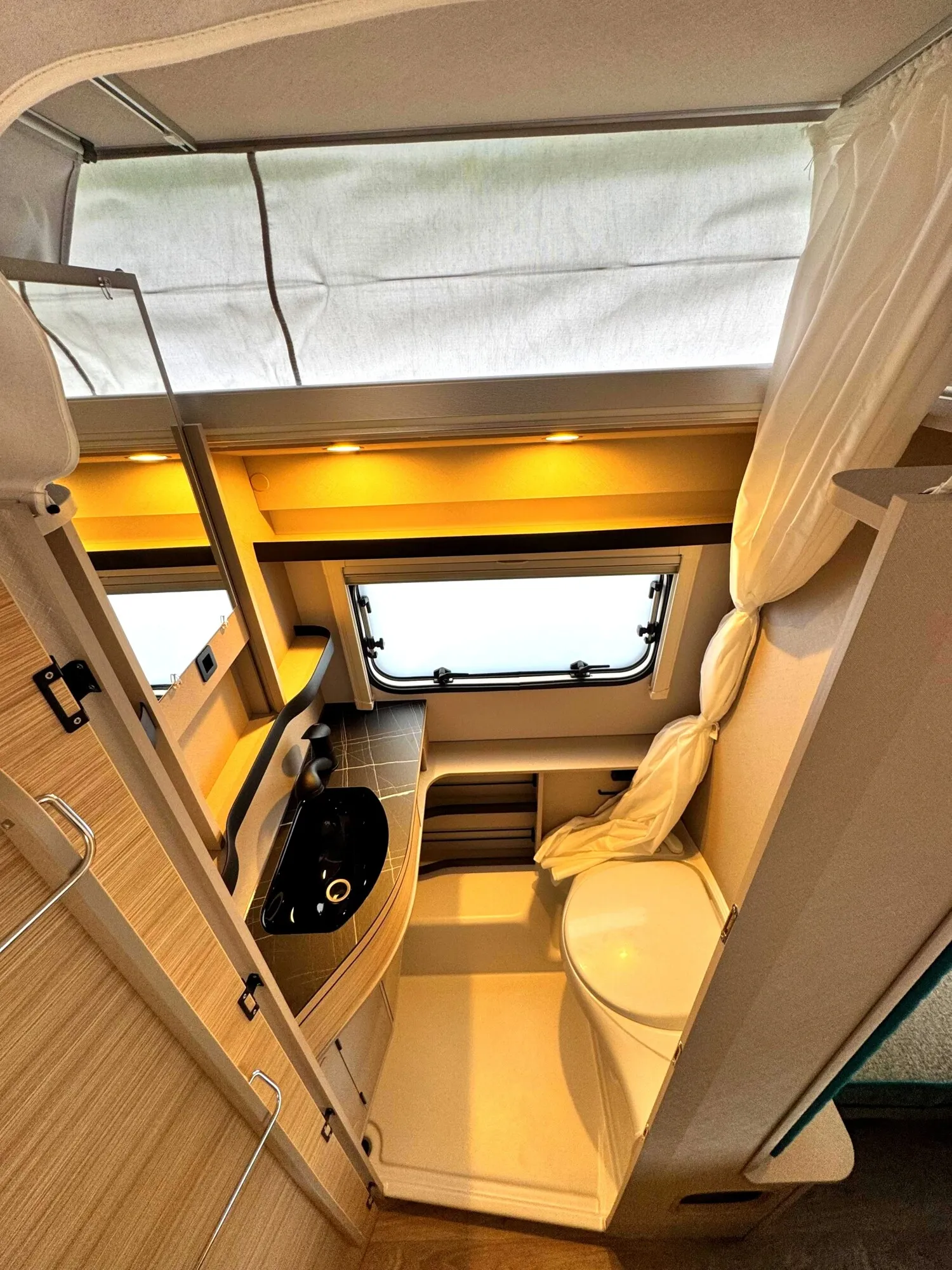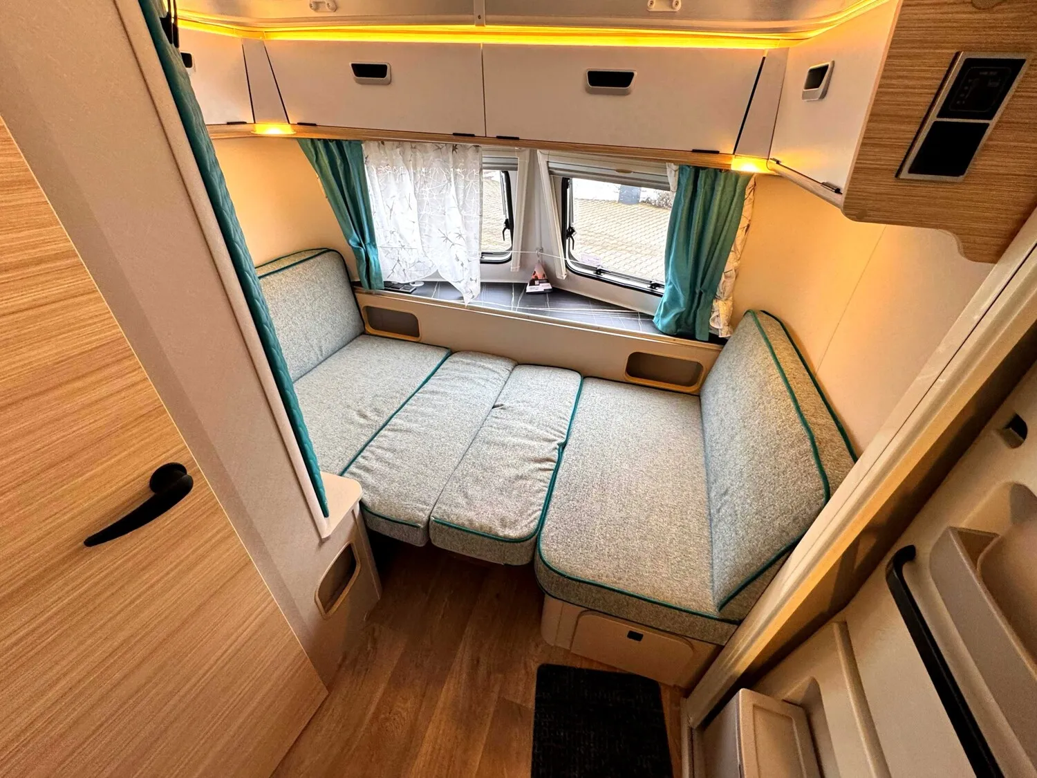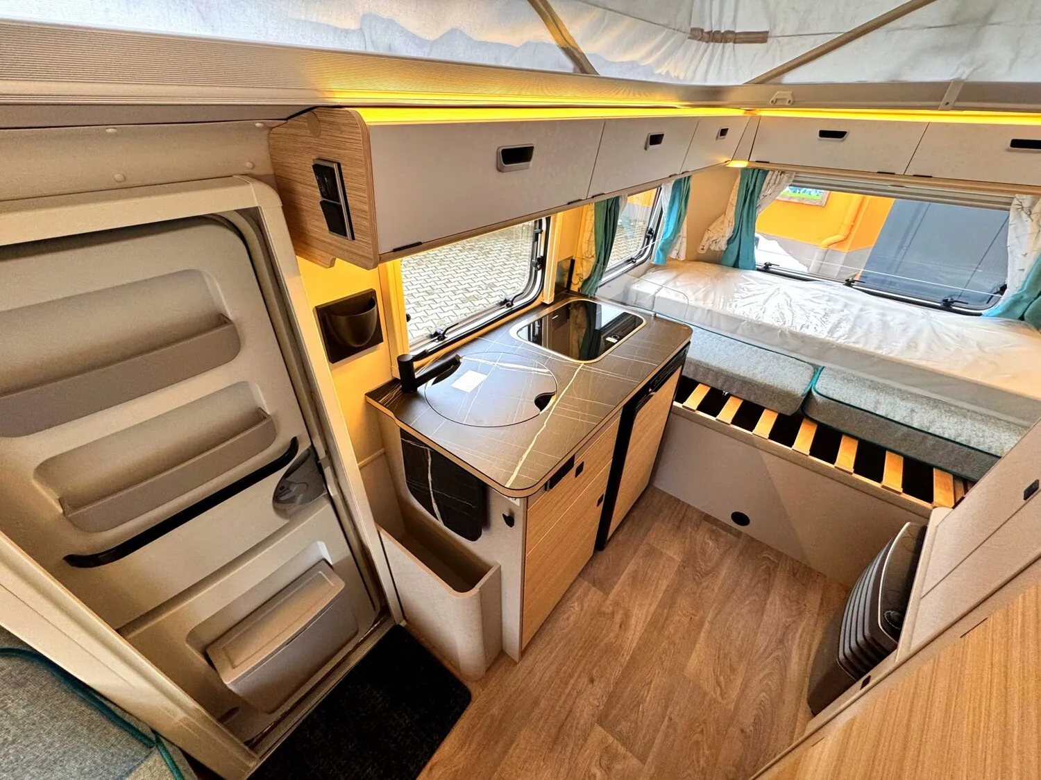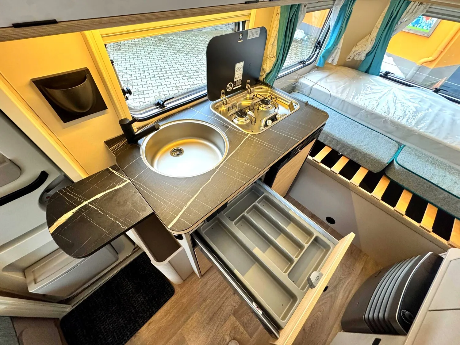 - Komfort Paket (Fliegenschutz-Rolltür (gesamte Türhöhe), bedienfreundlich durch seitliche Führung, Komfort-Plissee-Rollos, Steckdosenpaket (2 x 230 V Steckdosen und 1 x USB-Doppelsteckdose), Spülenabdeckung mit Schneidebrett, Abfalleimer in Eingangstür integriert, Zusätzlicher Vergrößerungsspiegel mit Magnethalterung)