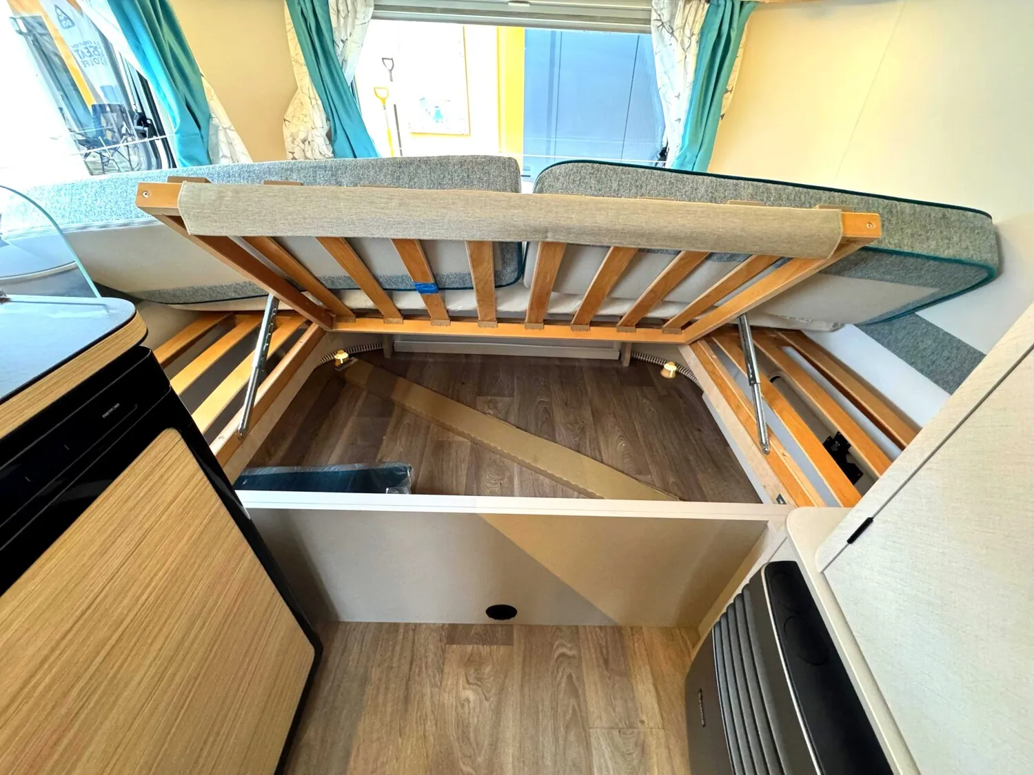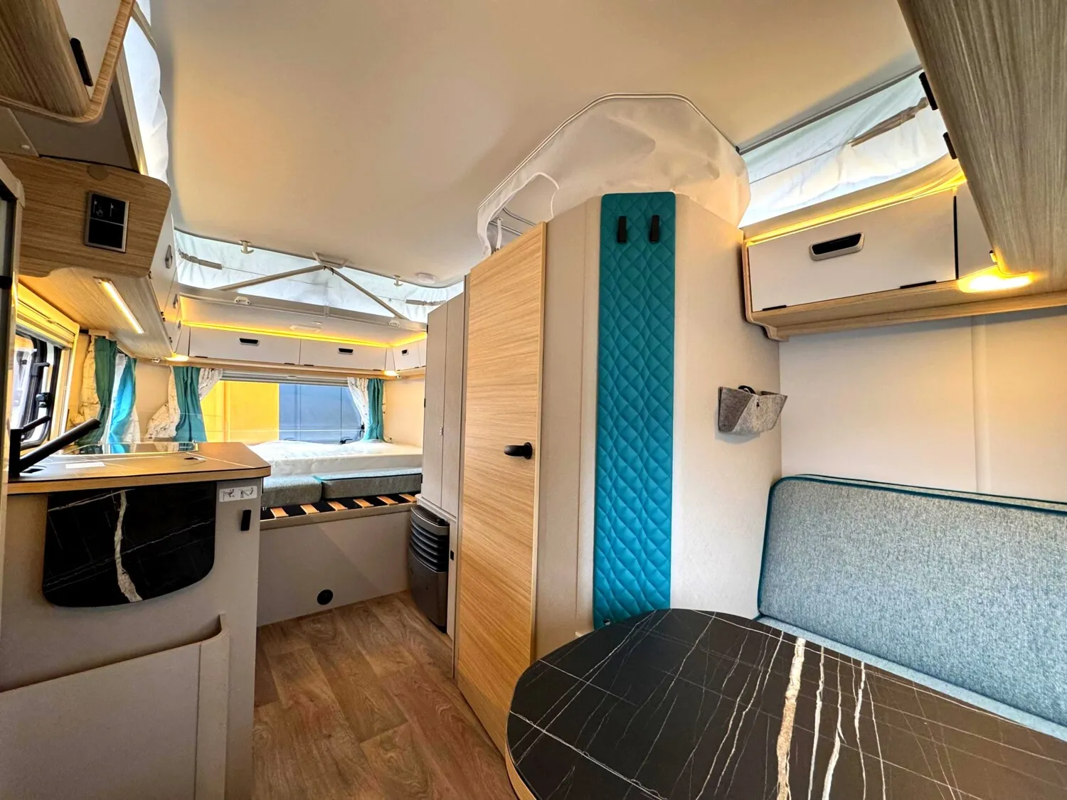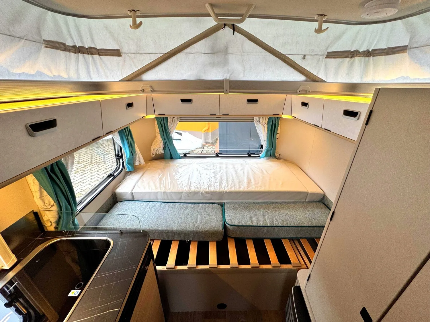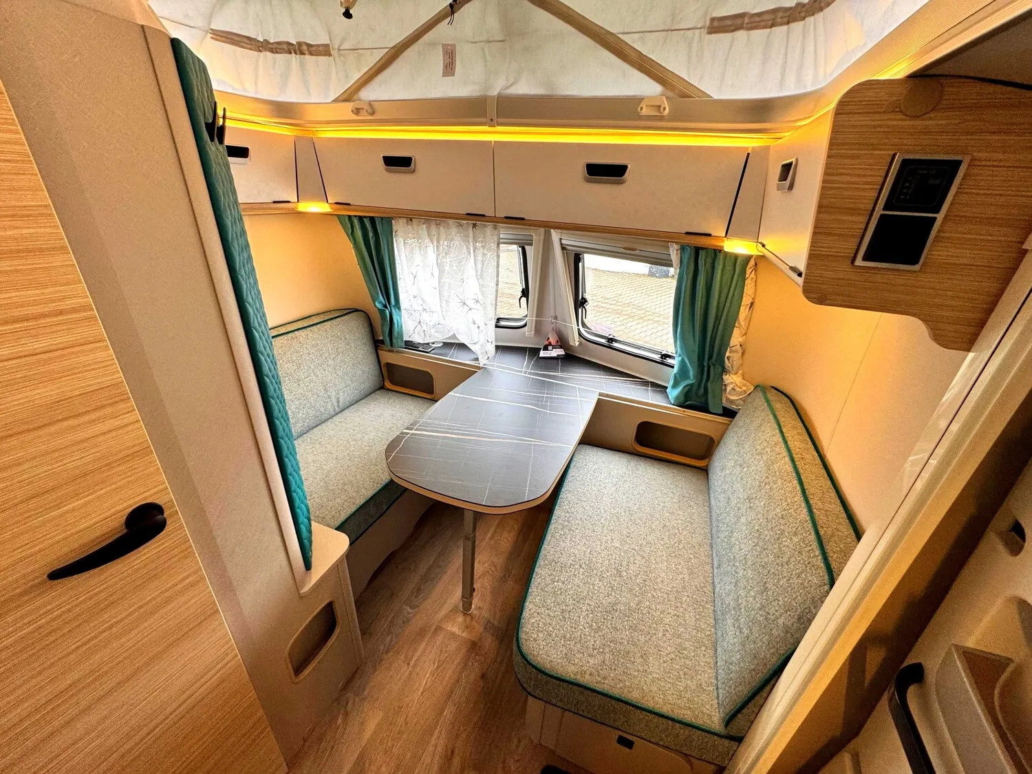 - Komfort Paket (Fliegenschutz-Rolltür (gesamte Türhöhe), bedienfreundlich durch seitliche Führung, Komfort-Plissee-Rollos, Steckdosenpaket (2 x 230 V Steckdosen und 1 x USB-Doppelsteckdose), Spülenabdeckung mit Schneidebrett, Abfalleimer in Eingangstür integriert, Zusätzlicher Vergrößerungsspiegel mit Magnethalterung)