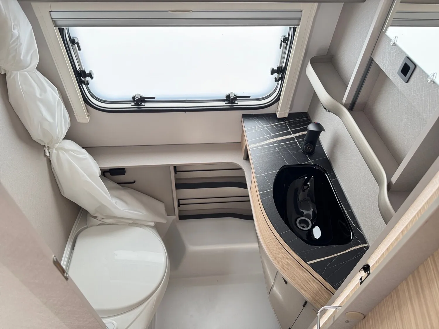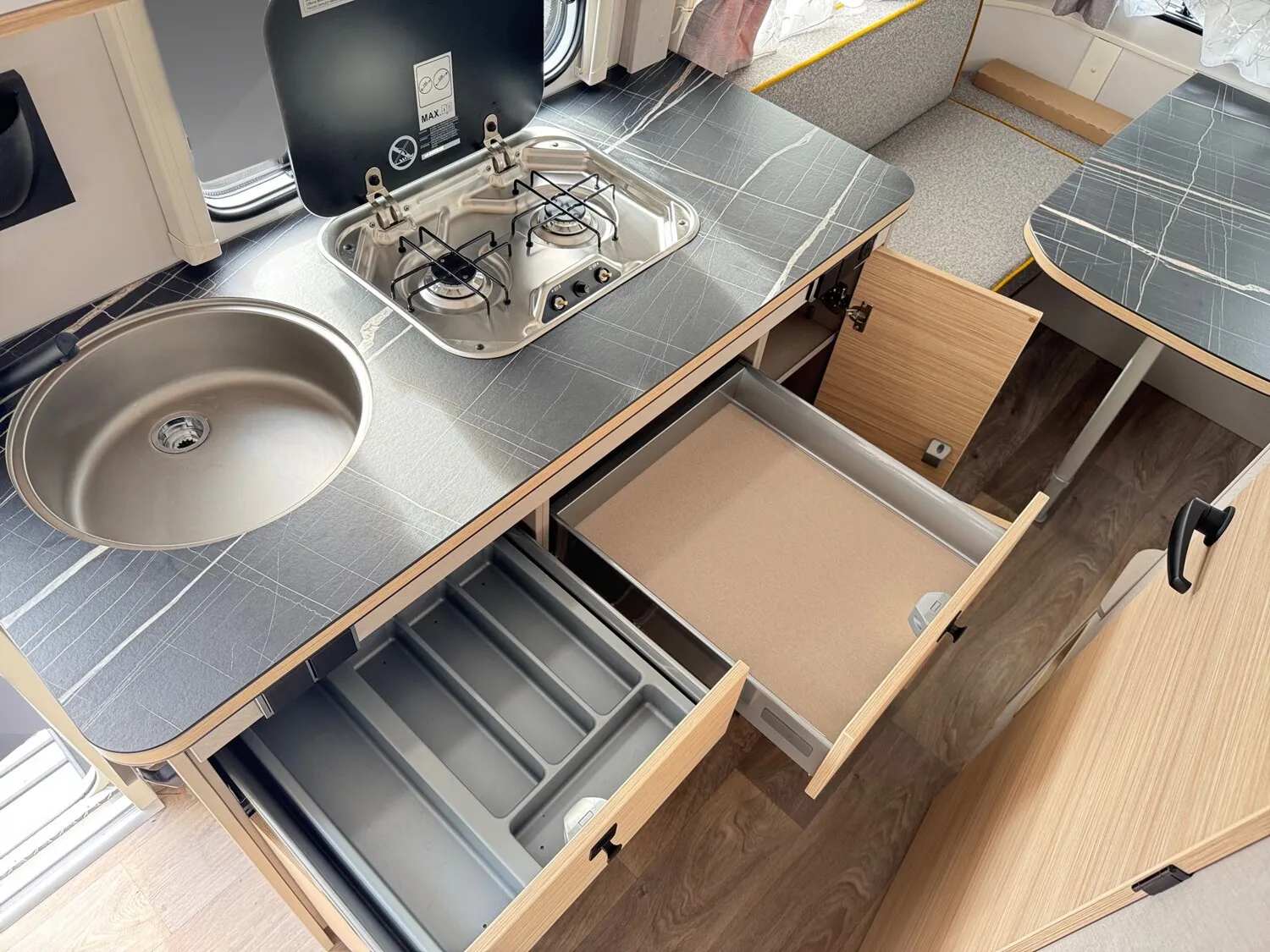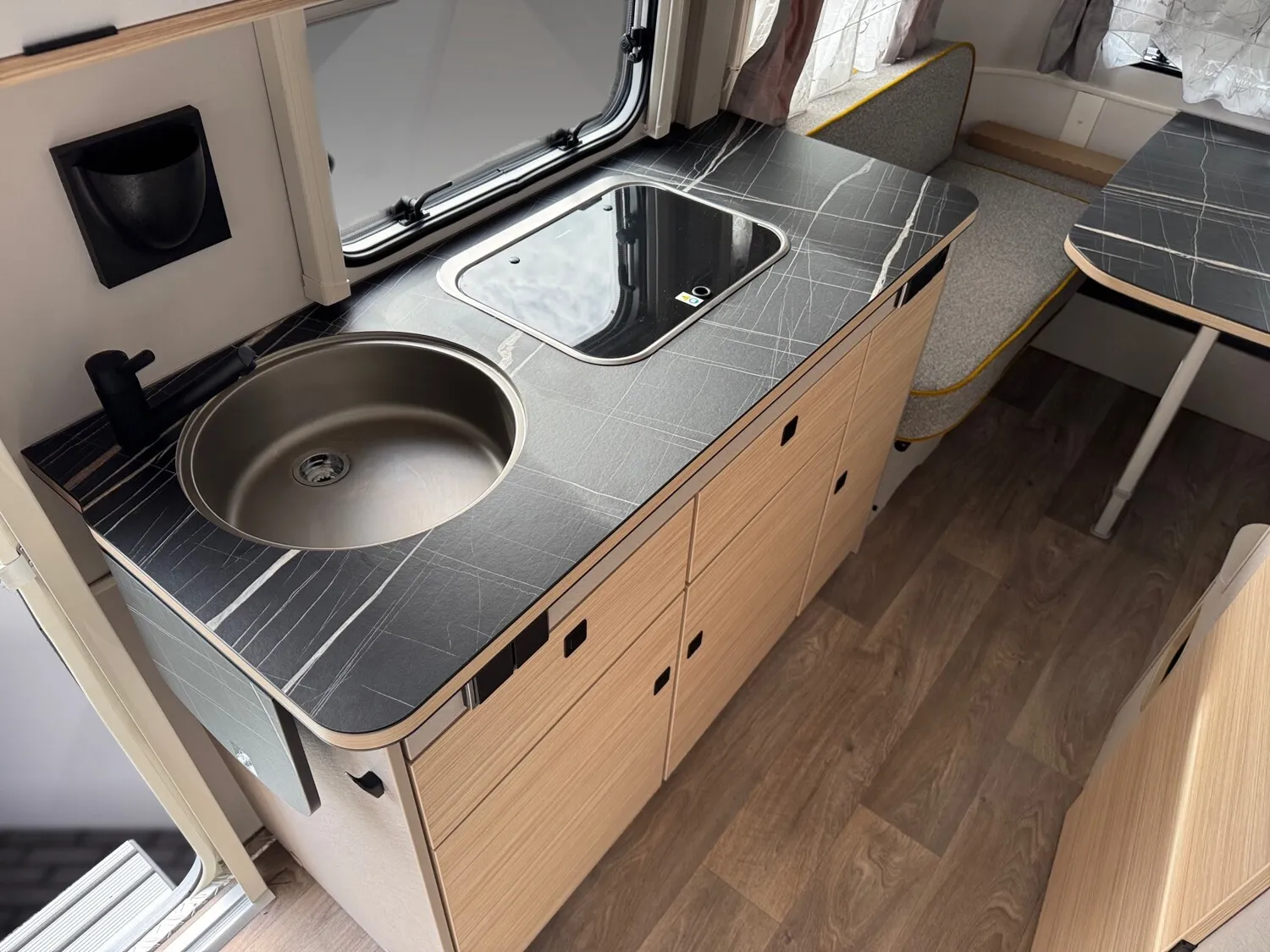 - Komfort Paket (Fliegenschutz-Rolltür (gesamte Türhöhe), bedienfreundlich durch seitliche Führung, Komfort-Plissee-Rollos, Steckdosenpaket (2 x 230 V Steckdosen und 1 x USB-Doppelsteckdose), Spülenabdeckung mit Schneidebrett, Abfalleimer in Eingangstür integriert, Zusätzlicher Vergrößerungsspiegel mit Magnethalterung)