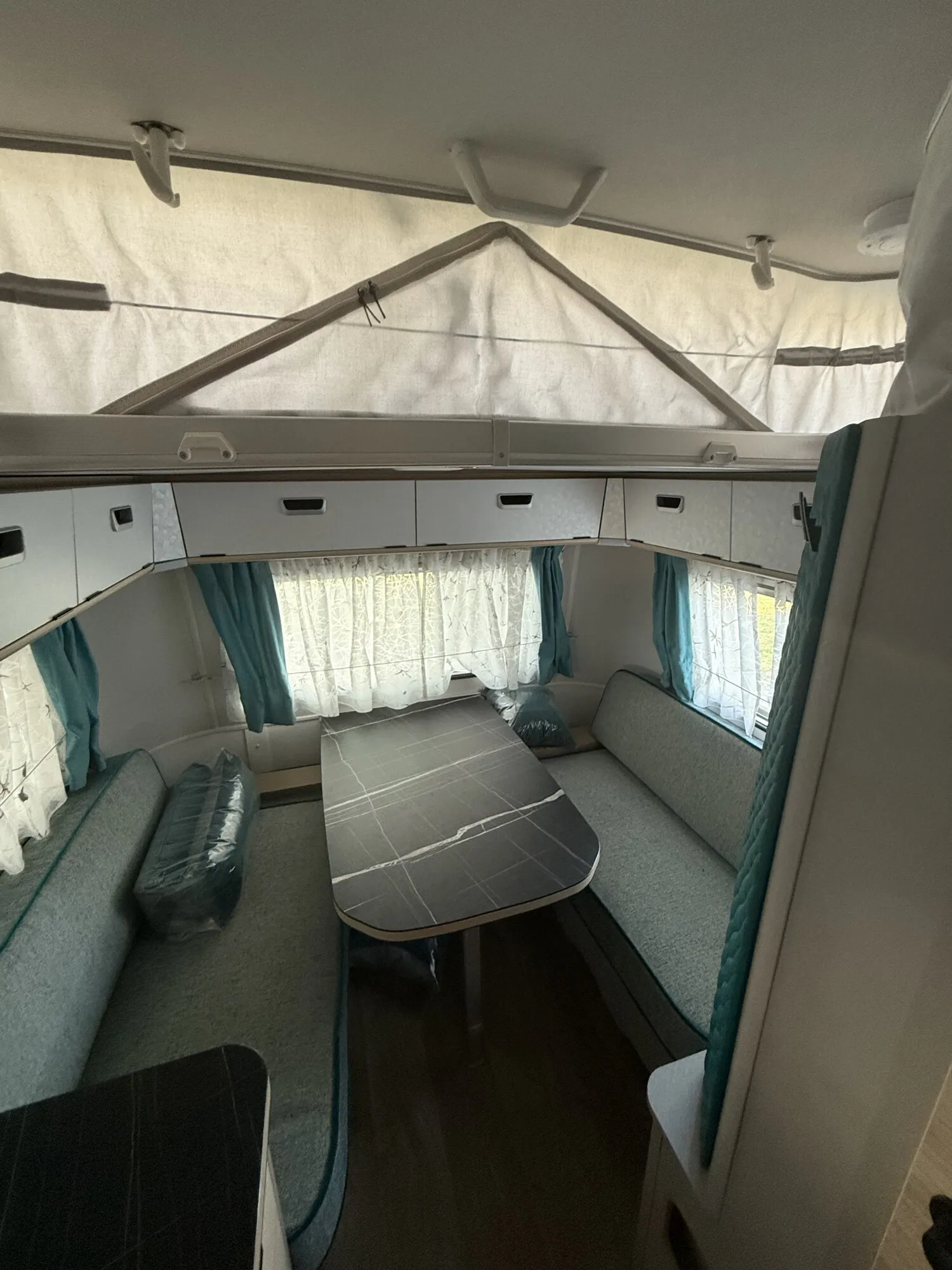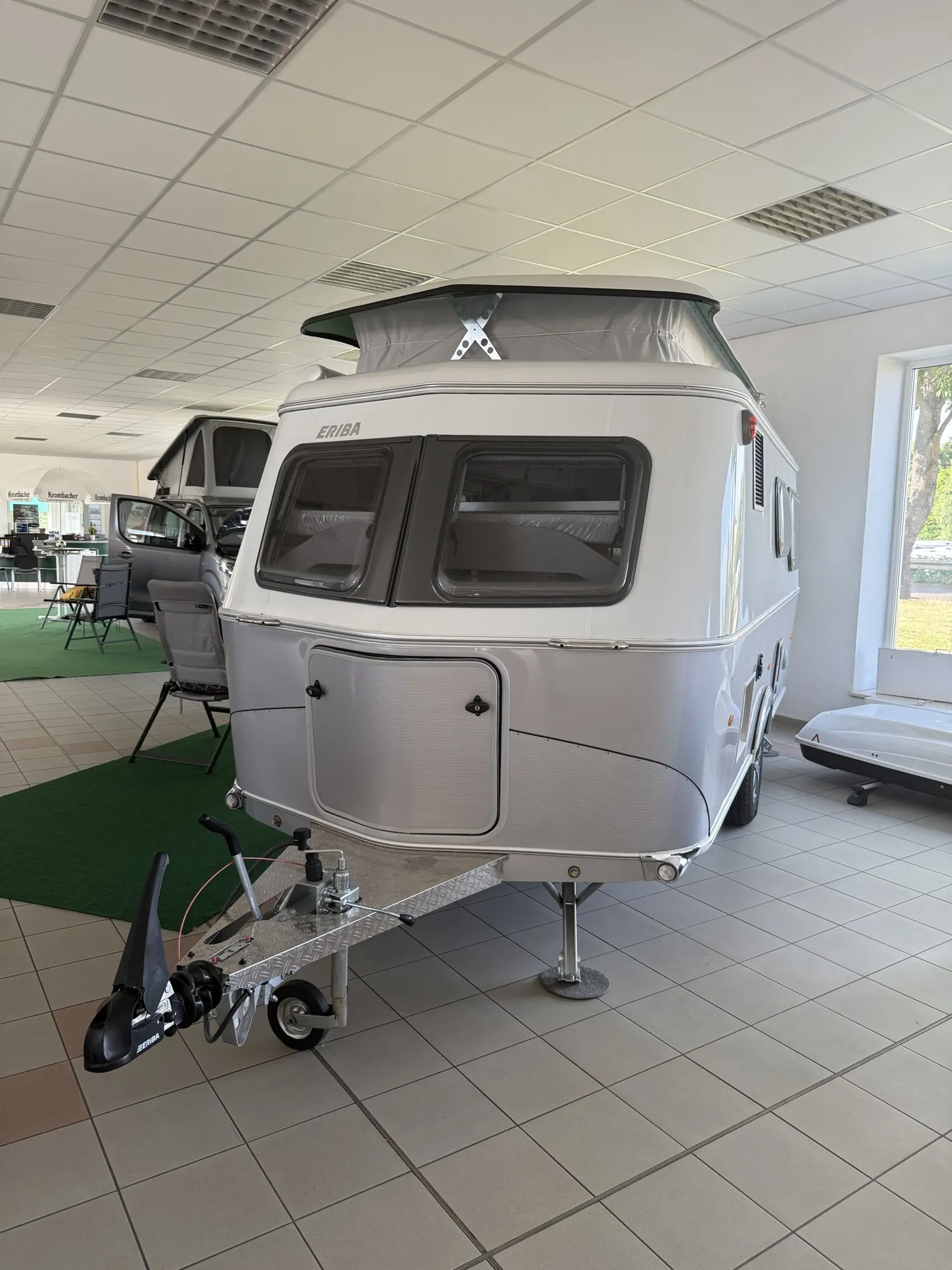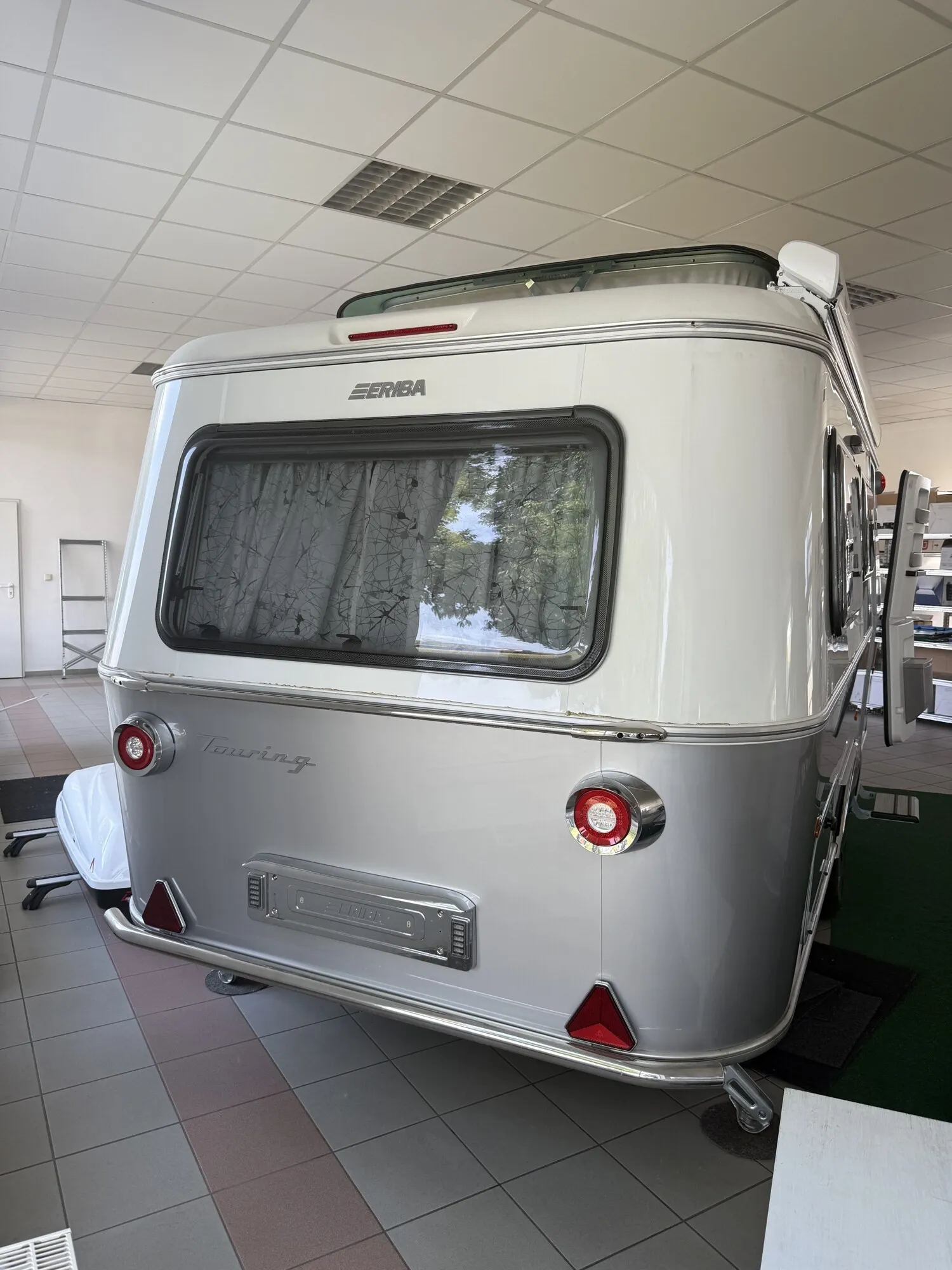 - Ausstattungslinie Urban (Seitenwände, Bug und Heck in Glattblech, Farbe White Silver, Möbeldekor Tindari, Ambientelicht XL mit indirektem Licht oberhalb der Dachstauschränke und zwei zusätzliche ERIBA Multifunktions-Akkuleuchten, 2 Kissen mit Bezug)