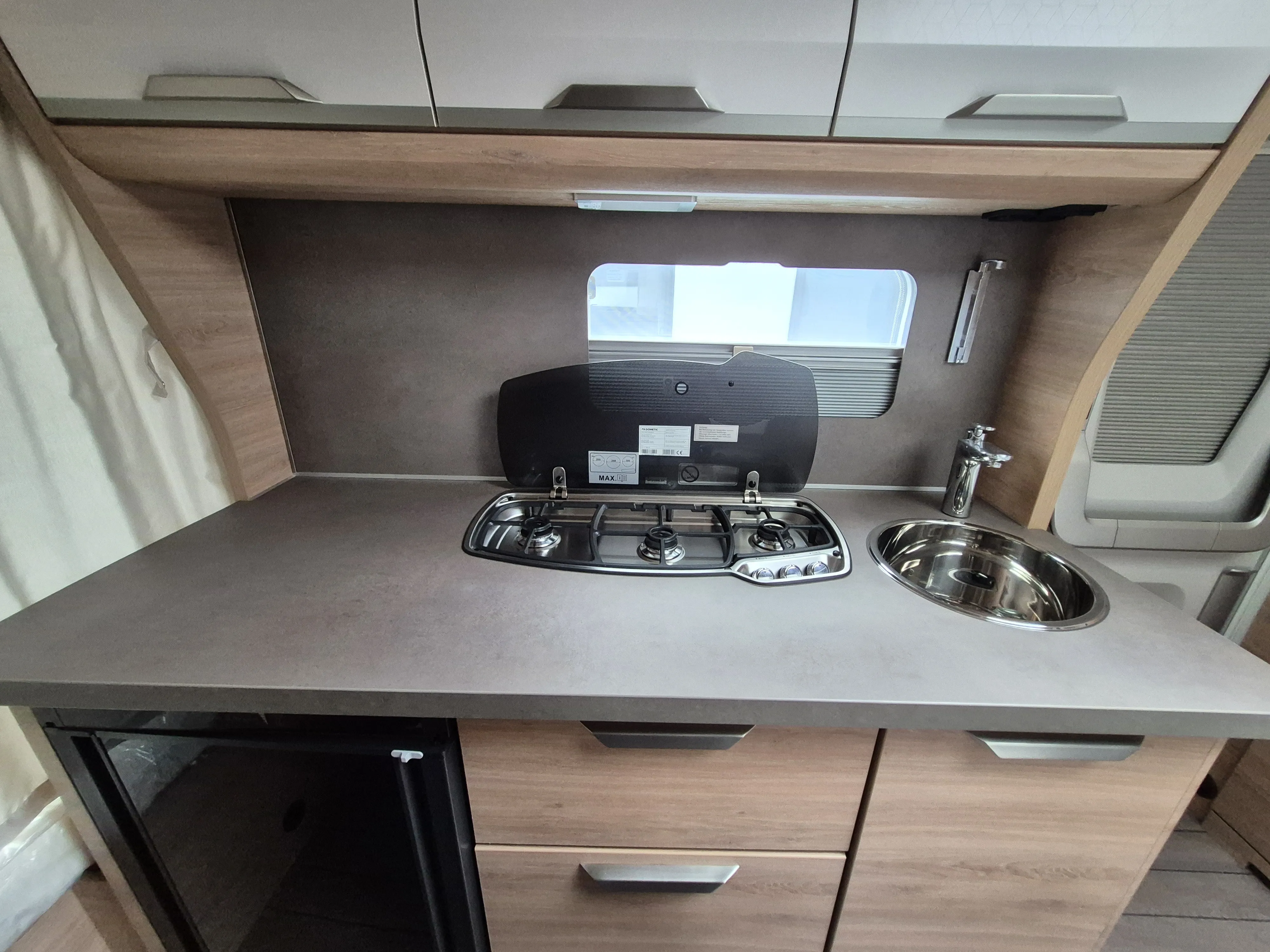 - 3-Flammen-Kocher mit elektrischer Zündung, Glasabdeckung und Spülbecken in Edelstahl