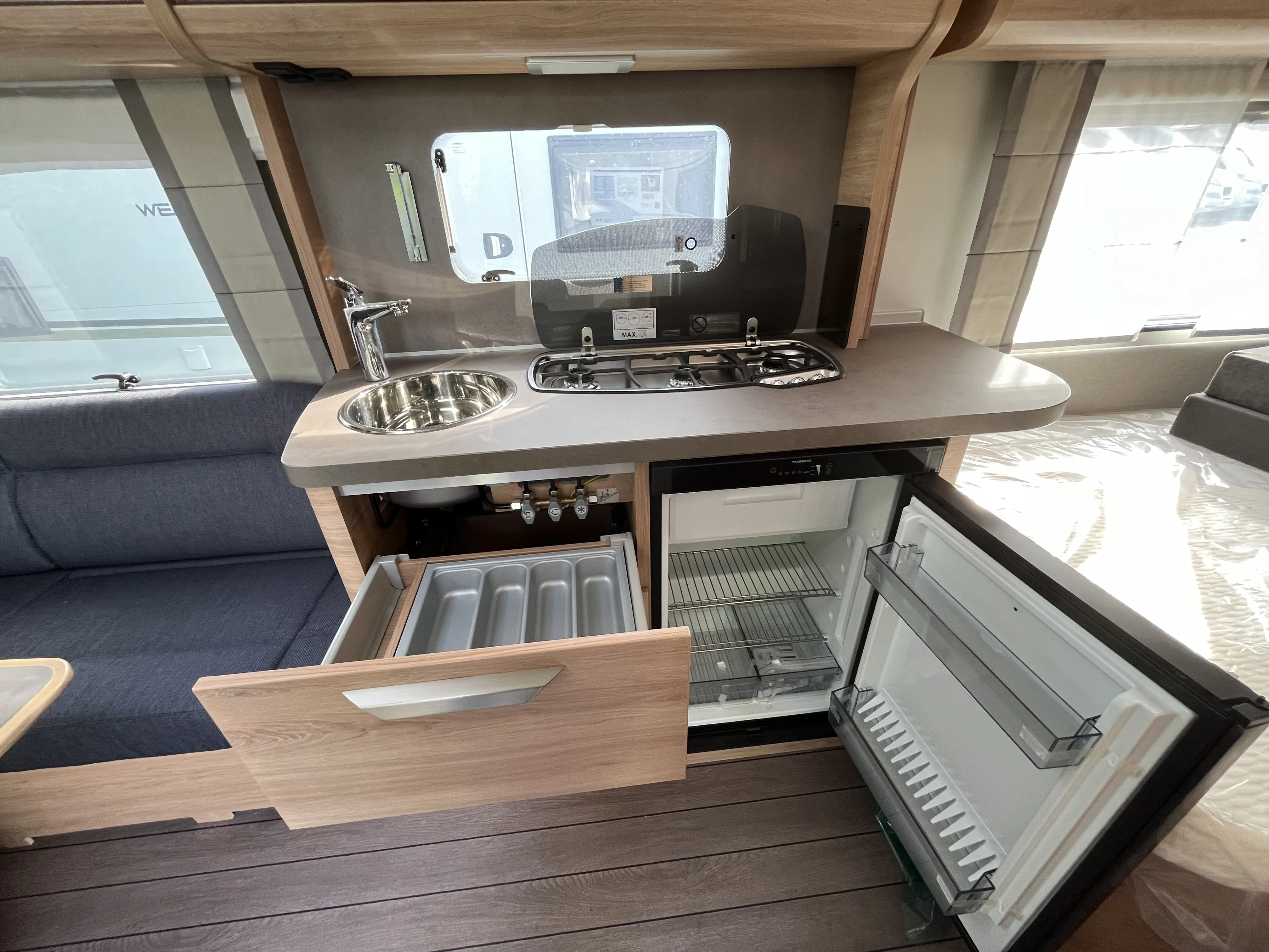 - 3-Flammen-Kocher mit elektrischer Zündung, Glasabdeckung und Spülbecken in Edelstahl