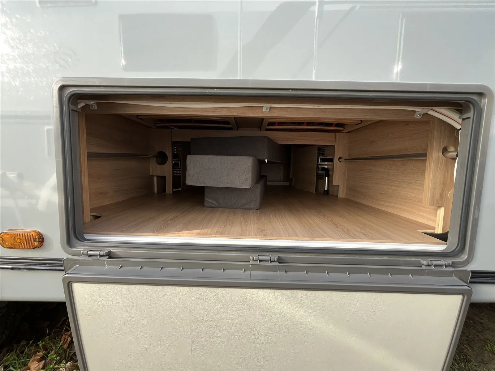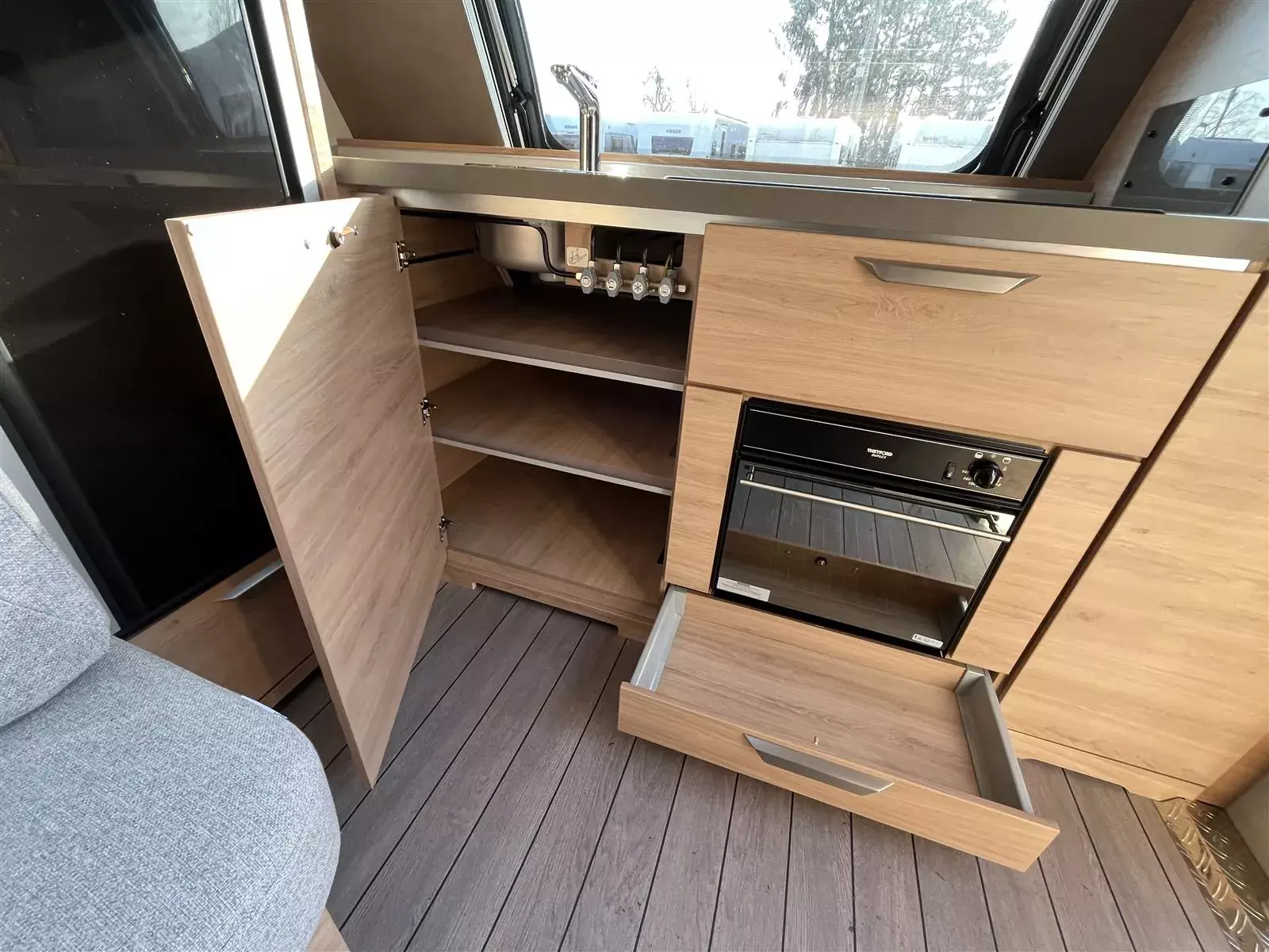 * Ein besonderes Highlight ist die ALDE Warmwasser-Heizung inklusive Fußbodenheizung, die im ganzen Wohnwagen eine sanfte, gleichmäßige Wärme erzeugt – perfekt für komfortorientierte Ganzjahres-Camper. Die hochwertige EvoPore-WaterGel-Matratze mit Tellerfedersystem im Queensbett sorgt für einen Schlafkomfort, der weit über dem üblichen Caravan-Niveau liegt. Dazu kommen viele sinnvolle Komfortdetails wie die DuoControl-Technik, Gasbackofen, Füllstandanzeigen, zusätzliche Stauraumlösungen und durchdachte Serviceklappen, die den Alltag unterwegs spürbar leichter machen.