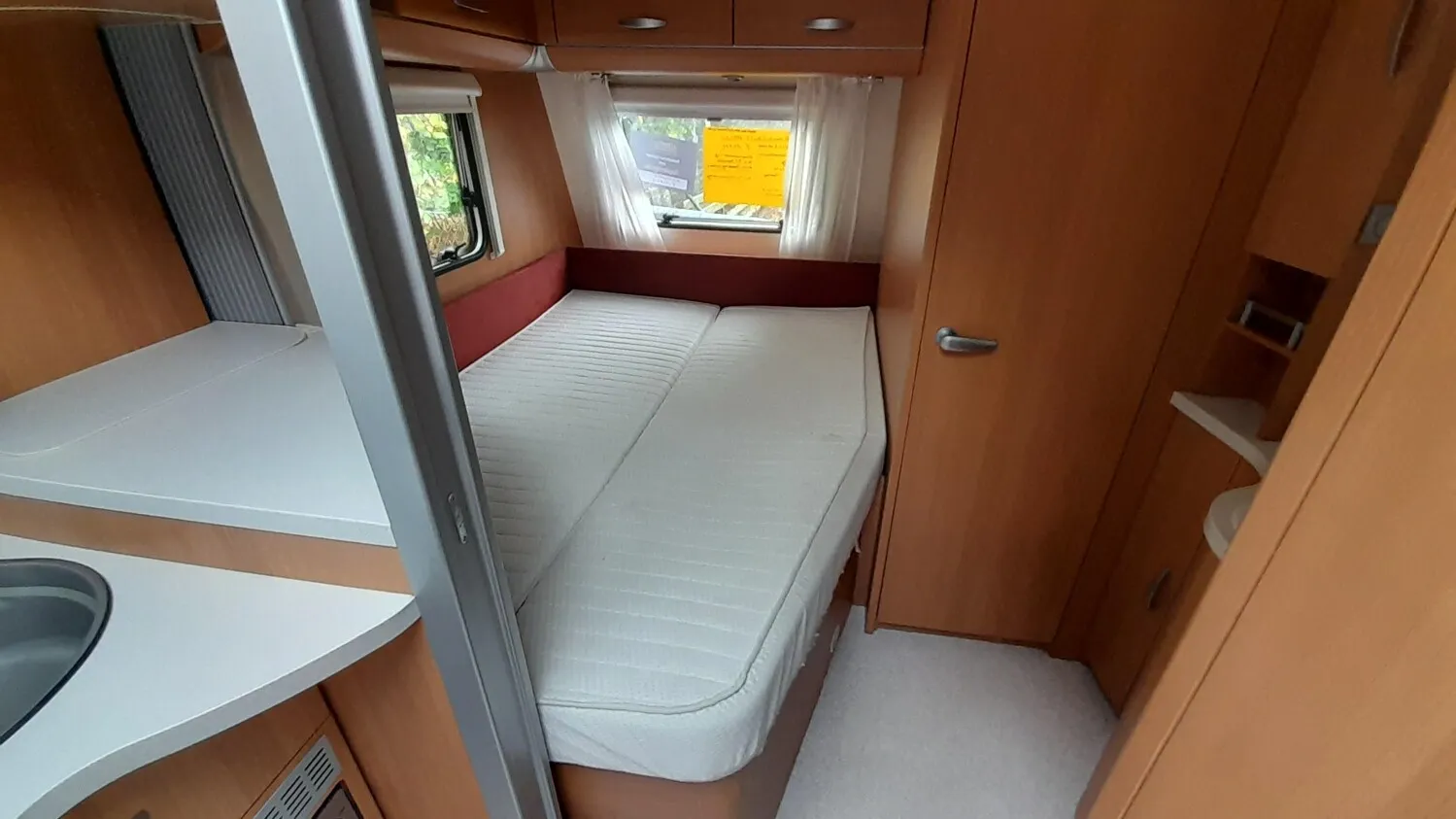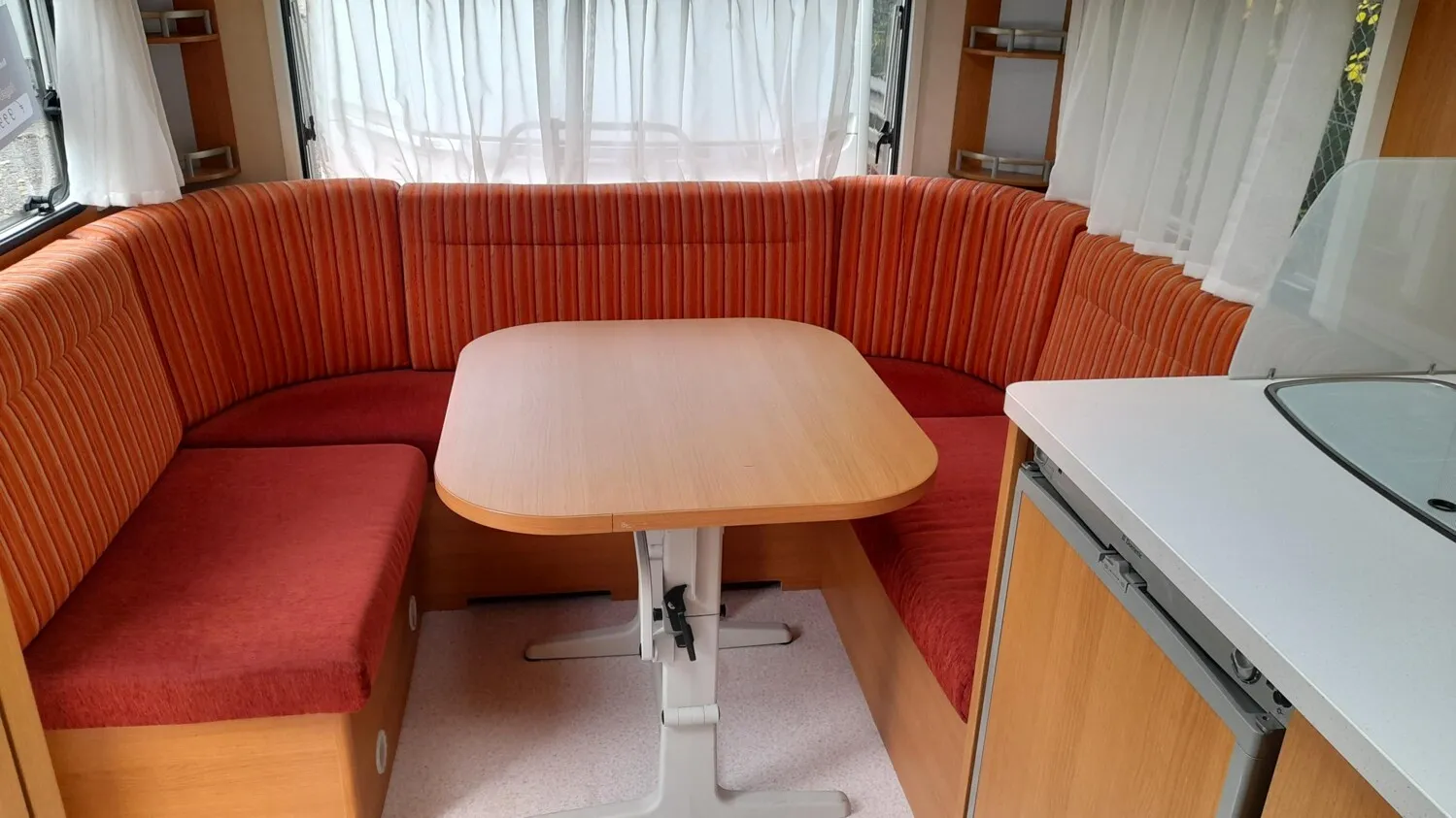 Schöner Knaus Sport 450 FU mit gemütlicher Rundsitzgruppe im Heck, Doppelbett längs vorne im Bug mit separatem Waschtisch und separatem WC-Bereich mit Duscheinrichtung, Küche mit Mikrowelle, Spüle, Gaskocher und Kühlschrank.