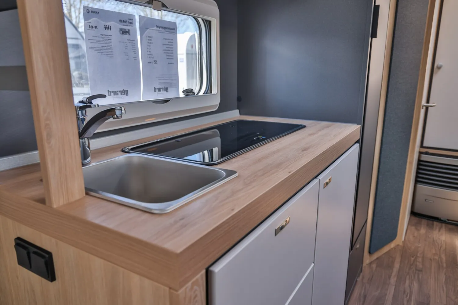 - Design-Paket - Monoachser (17" Leichtmetallfelgen ? Monoachser, Titanmetallic lackiert im exklusiven KNAUS Design, Seitenwände in Glattblech ? Monoachser, KNAUS Embleme im Bug und im Heck, schwarz/chrom, Deichselabdeckung)