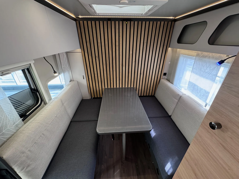 - Transport-Paket: Serviceklappe 70 x 30,5 cm, Heck rechts & links / Garagentür 62,5 x 110 cm, rechts / Verzurr-Ösen und Verzurrschienen im Wohnraum / Variable Sitzgruppe für Fahrradtransport