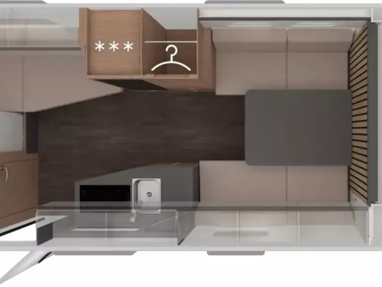 - Einzelbett / Lounge-Ecke im Heck ausziehbar zum Doppelbett