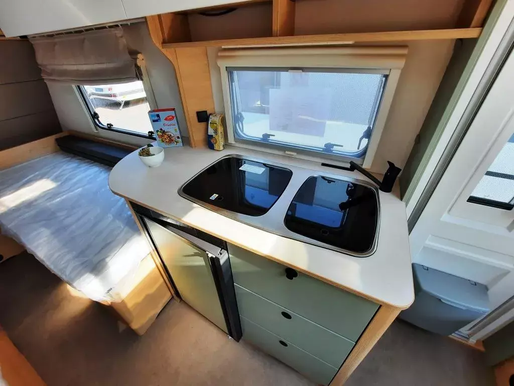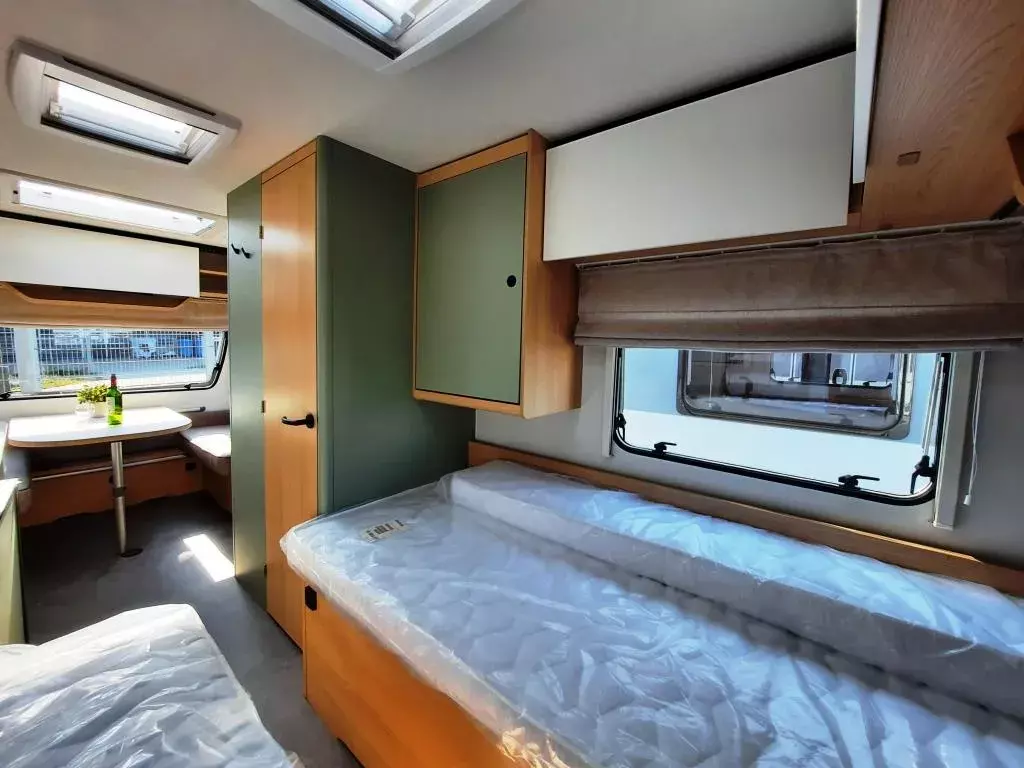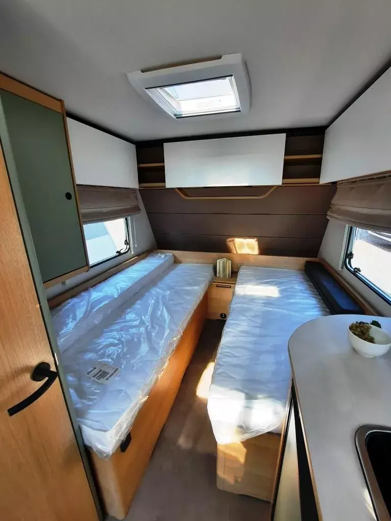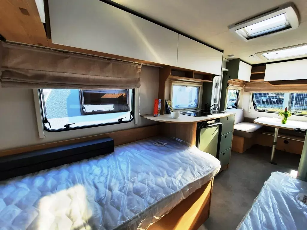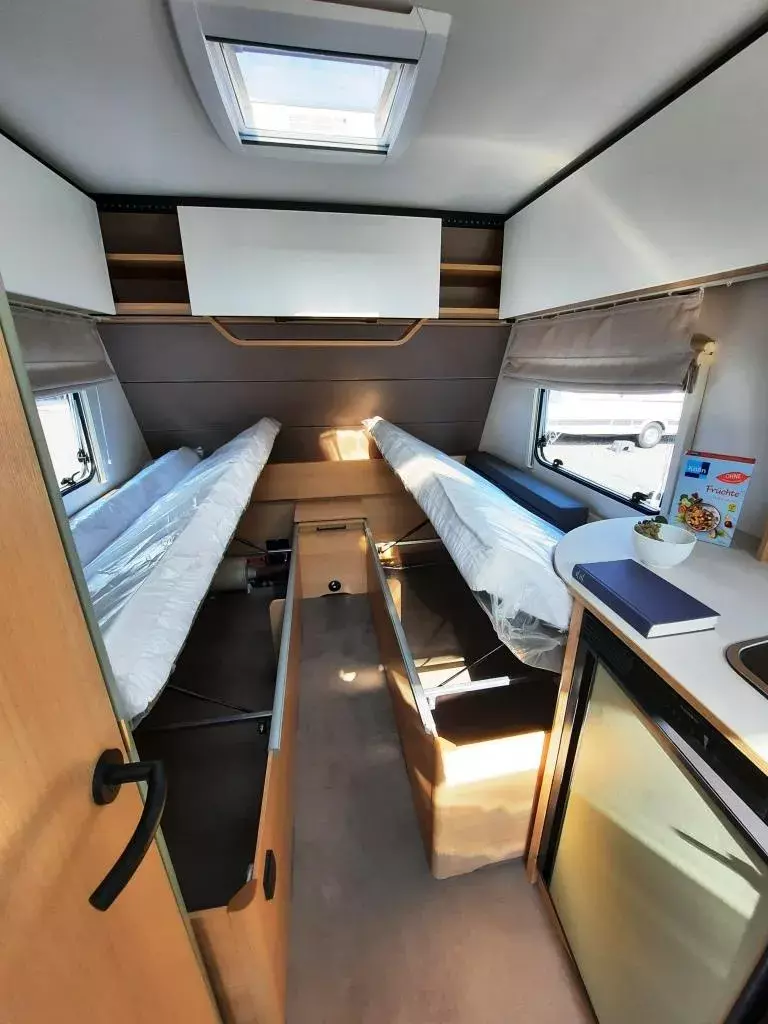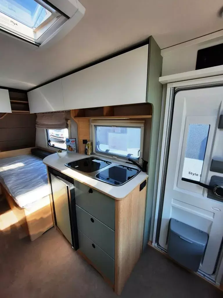 - Style Paket (Vorbereitung TV-Platz, Vorzeltleuchte LED, Deichselabdeckung, Reserveradhalterung im Flaschenkasten, Fliegenschutztür, LED-Ambientebeleuchtung, Therme für Warmwasserversorgung, Umluftanlage 230V, Eingangstür mit Fenster – einteilig inkl. Abfalleimer, Abwassertank 25l rollbar, Frischwassertankanzeige, 2x USB-Steckdose für Stromschiene, Dachverstärkung inkl. Vorbereitung für Klimaanlage, Stützrad mit Stützlastanzeige, Stabilformstützen inkl. Big Foots, Dachhaube 960x655 mm)