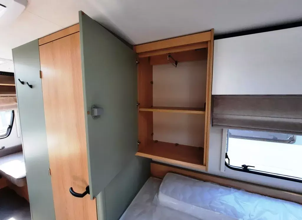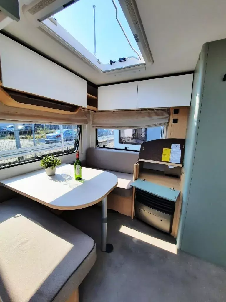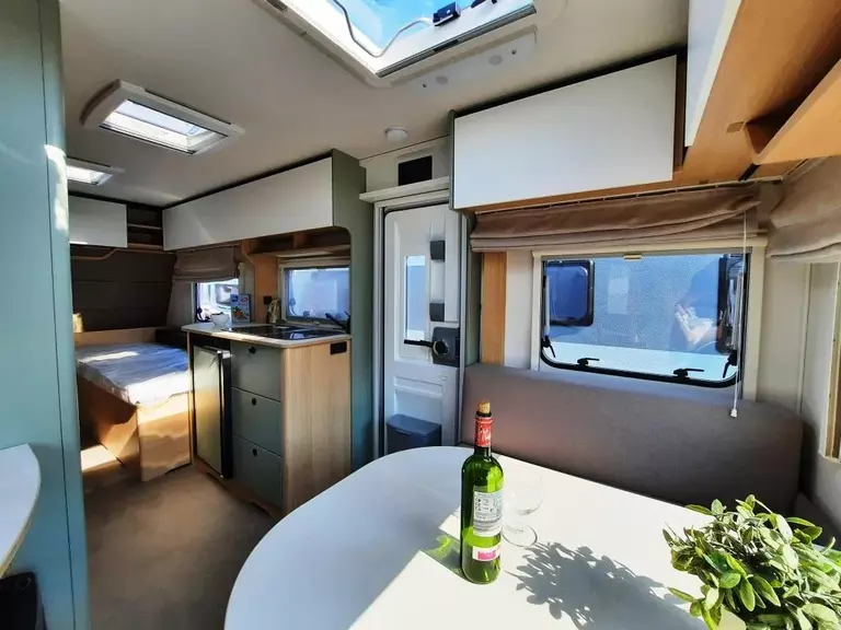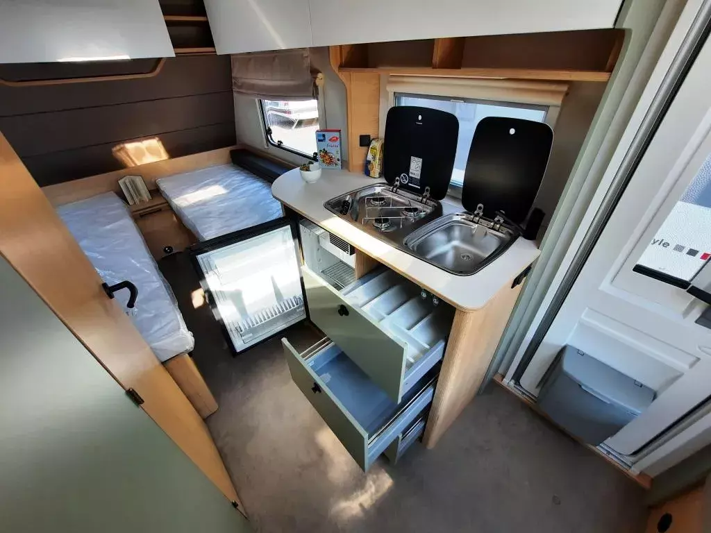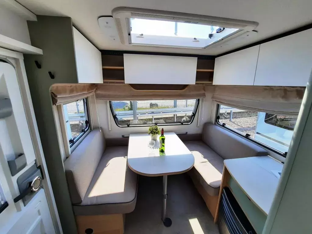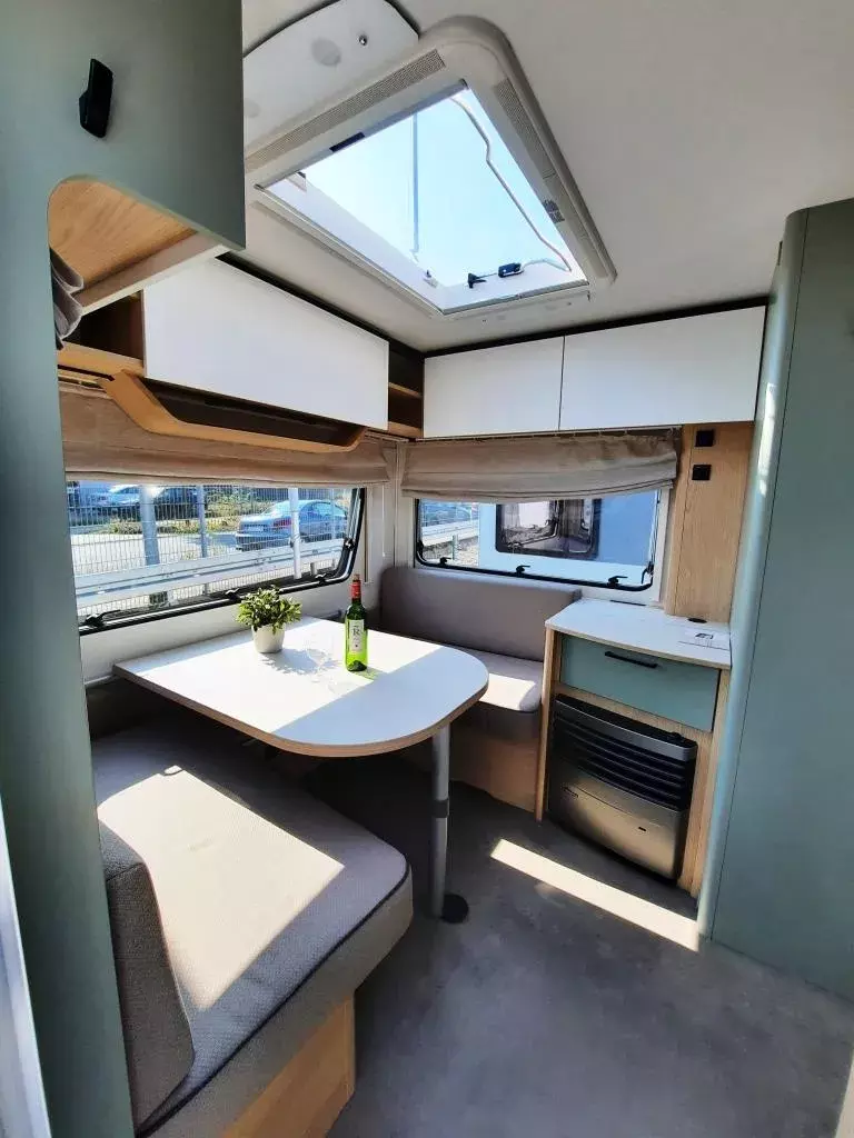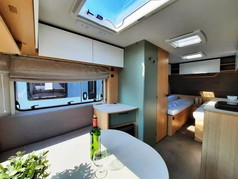 - Style Paket (Vorbereitung TV-Platz, Vorzeltleuchte LED, Deichselabdeckung, Reserveradhalterung im Flaschenkasten, Fliegenschutztür, LED-Ambientebeleuchtung, Therme für Warmwasserversorgung, Umluftanlage 230V, Eingangstür mit Fenster – einteilig inkl. Abfalleimer, Abwassertank 25l rollbar, Frischwassertankanzeige, 2x USB-Steckdose für Stromschiene, Dachverstärkung inkl. Vorbereitung für Klimaanlage, Stützrad mit Stützlastanzeige, Stabilformstützen inkl. Big Foots, Dachhaube 960x655 mm)