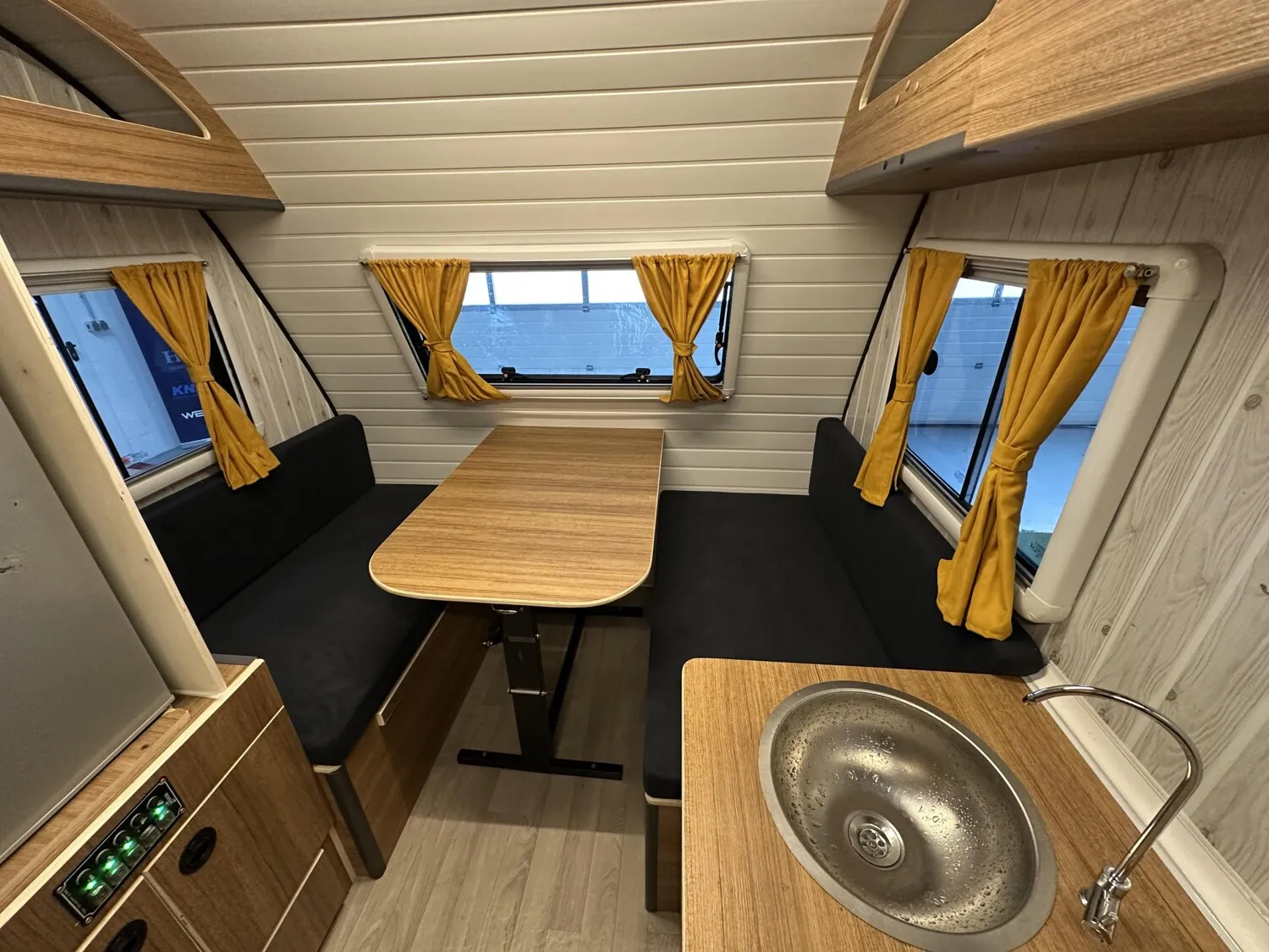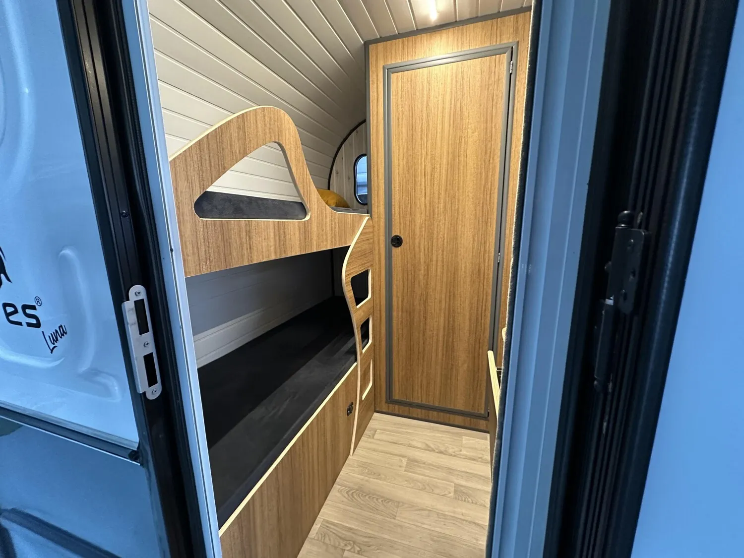 Mit Kinderetagenbetten quer im Heck, Sitzgruppe mit Tisch im Bug. Sitzgruppe ist als Bett umbaubar