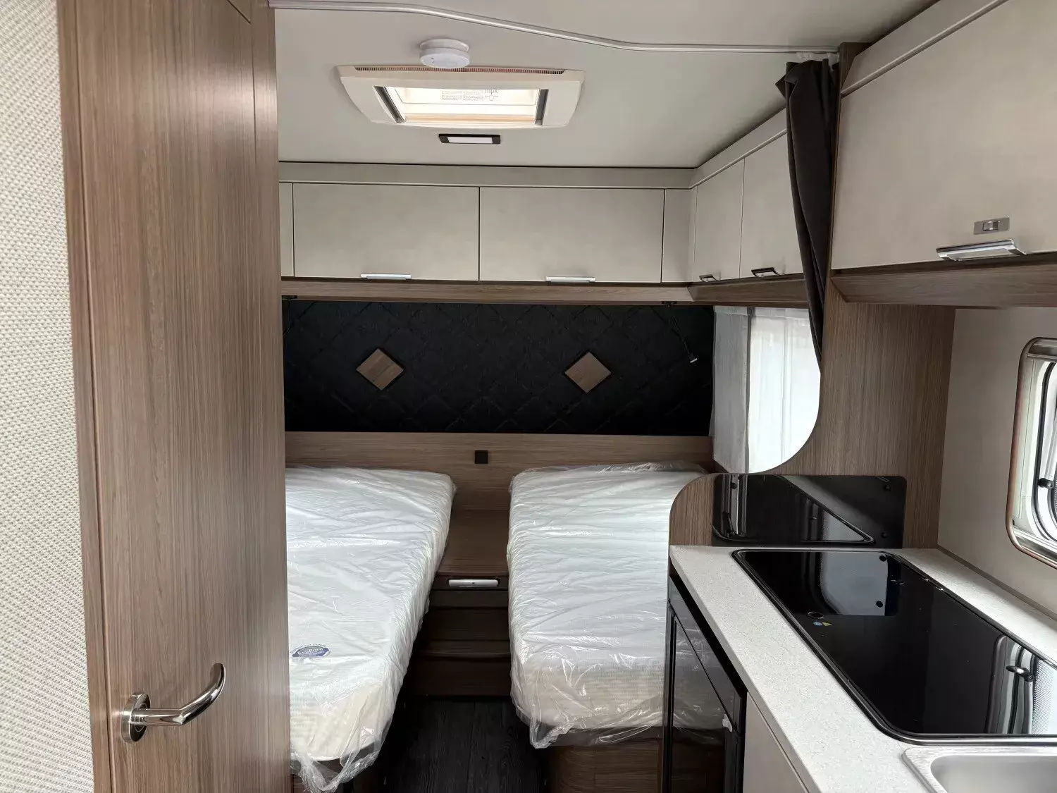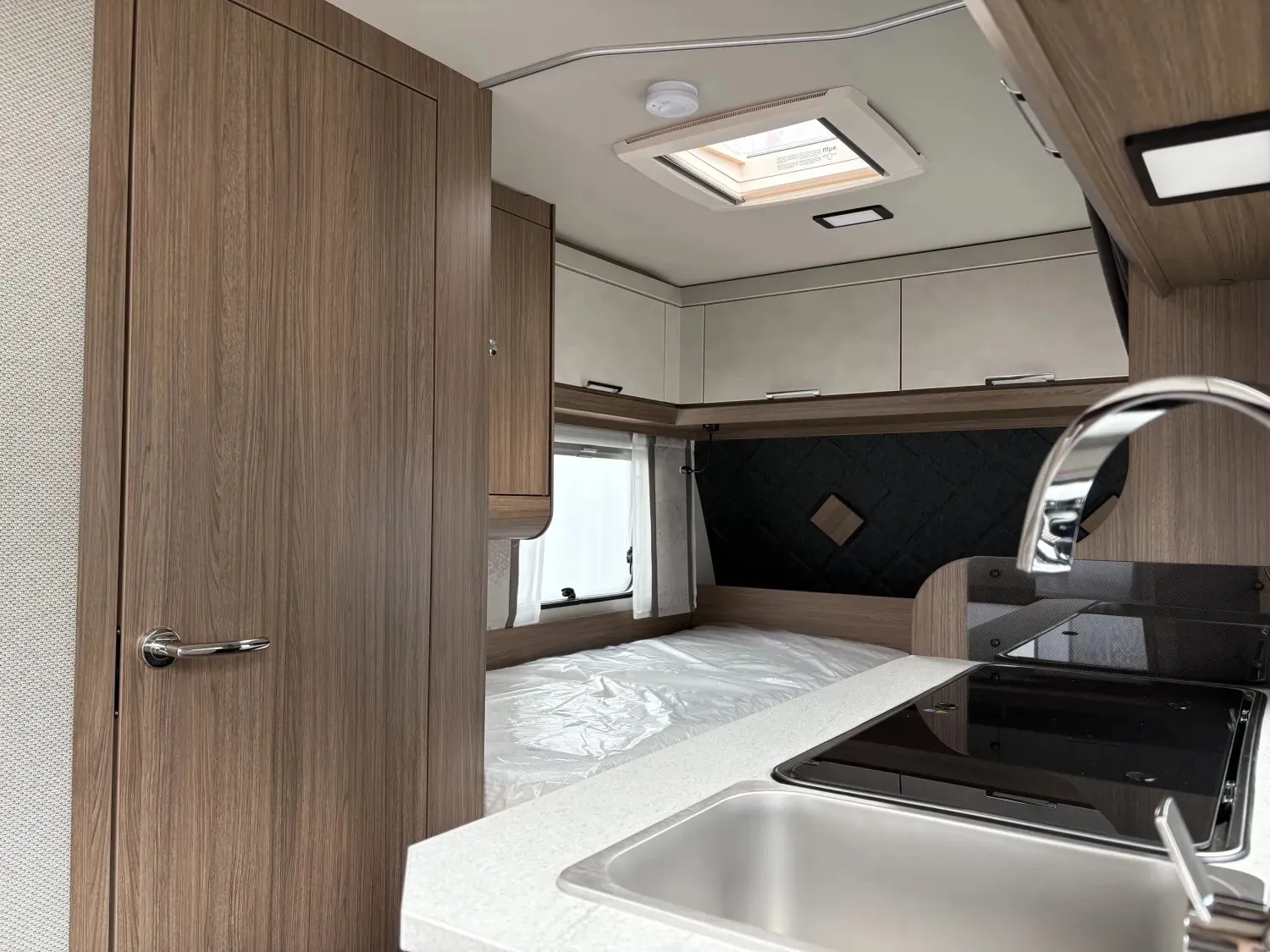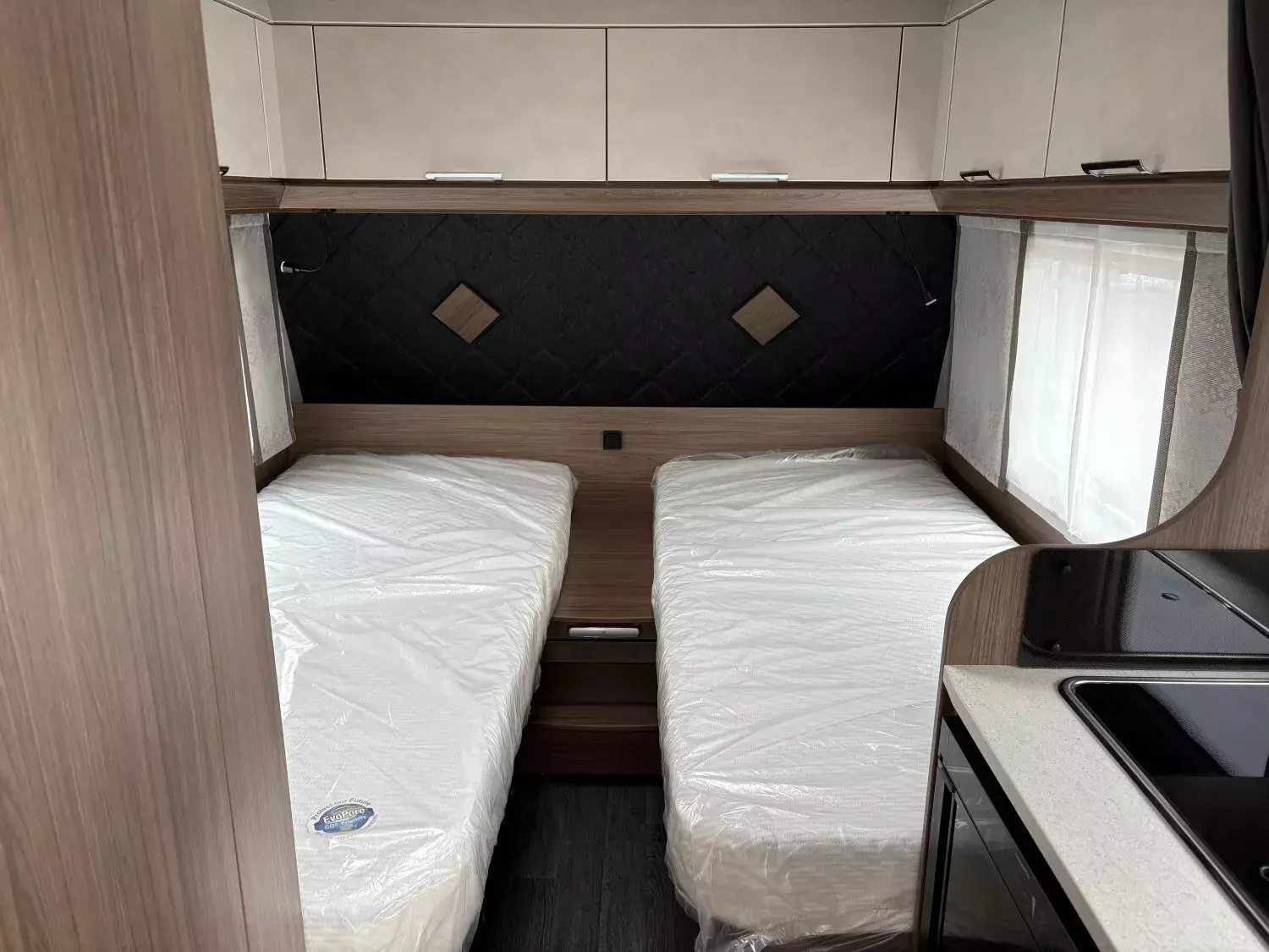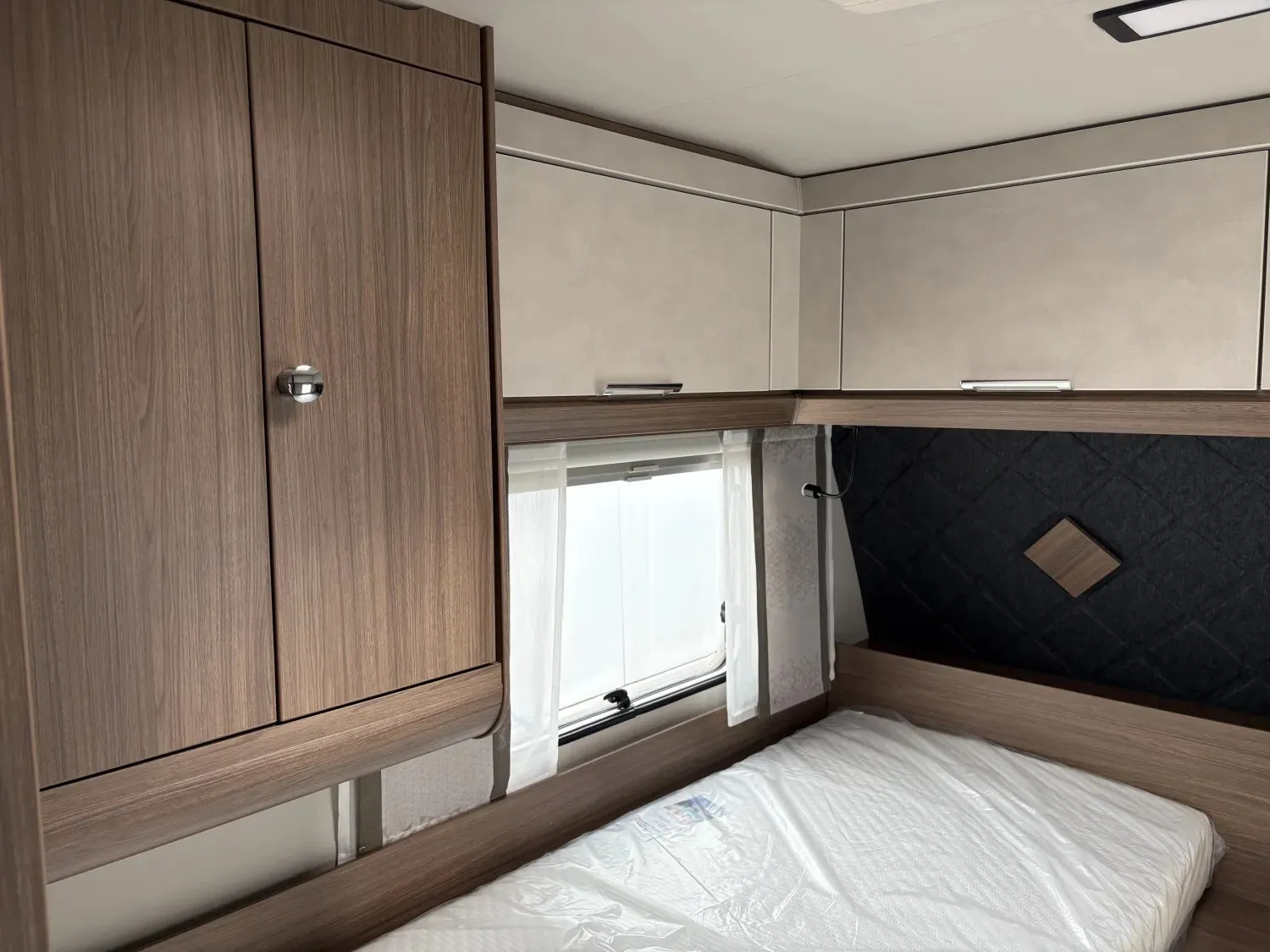 - Premium Interieur-Paket I (Deko-Paket Schlafen "CAZADORA": 4 Kissen und 2 Decken im Schlafbereich, TABBERT Komfort Schlafsystem mit flexiblem Tellerrost und WaterGEL-Matratze, Insektenschutztür, Füllstandsanzeige für Frischwassertank)
