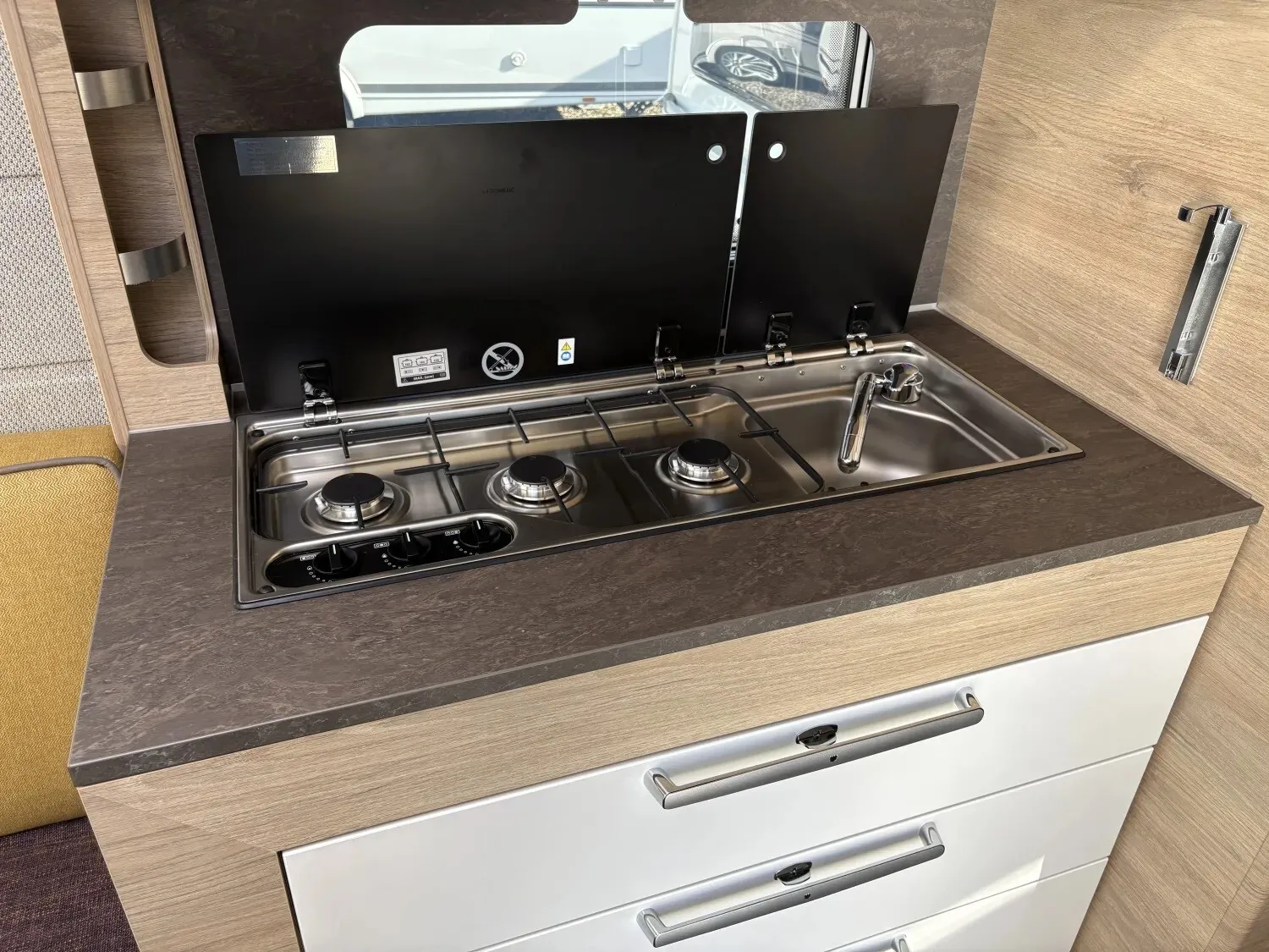 - Kocher-Spülen-Kombination inkl. 3-Flammen-Kocher mit elektrischer Brennerzündung und geteilter Glasabdeckung, fest verbaut