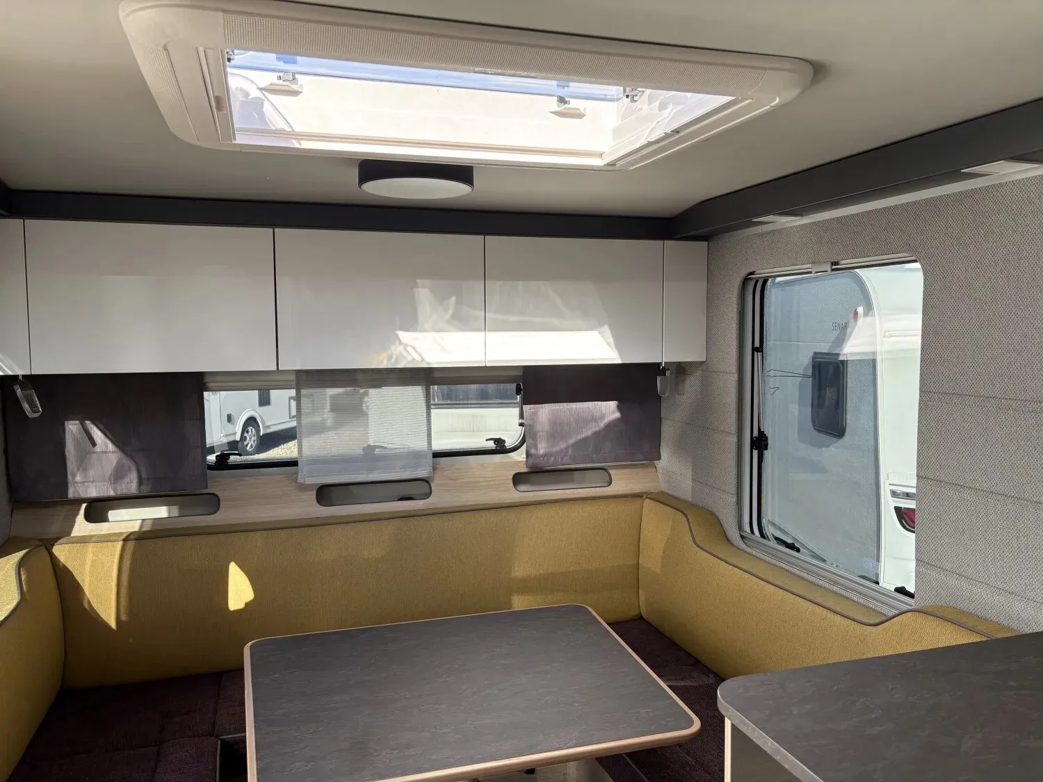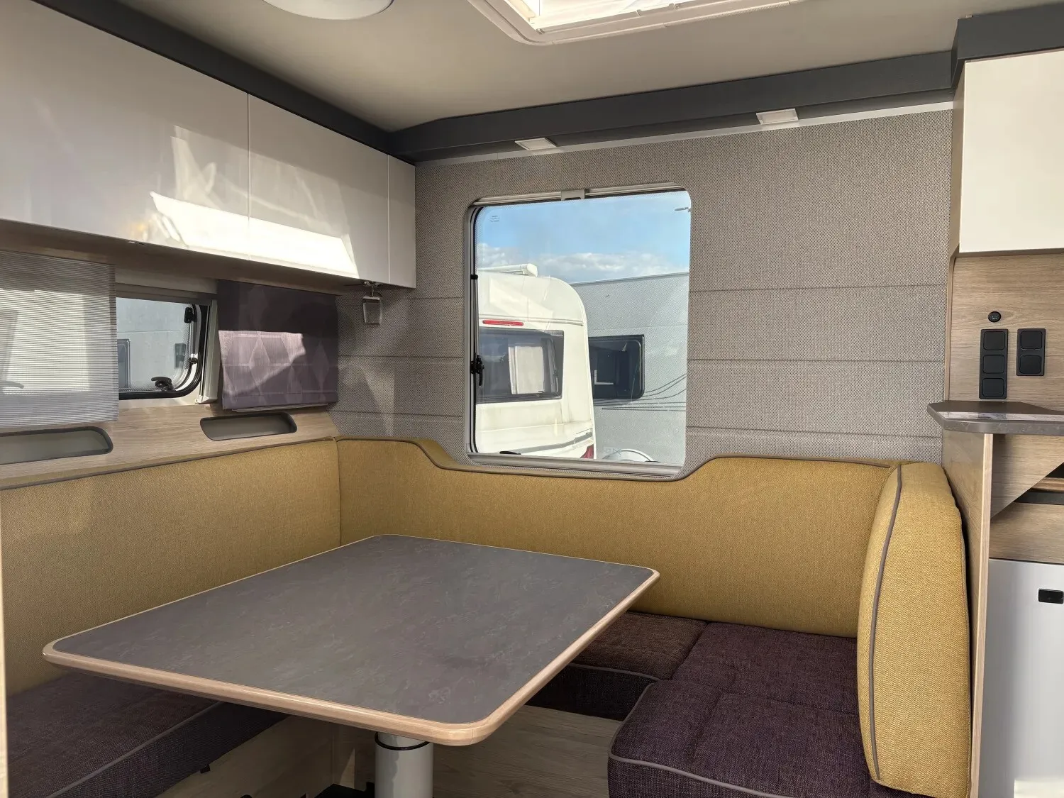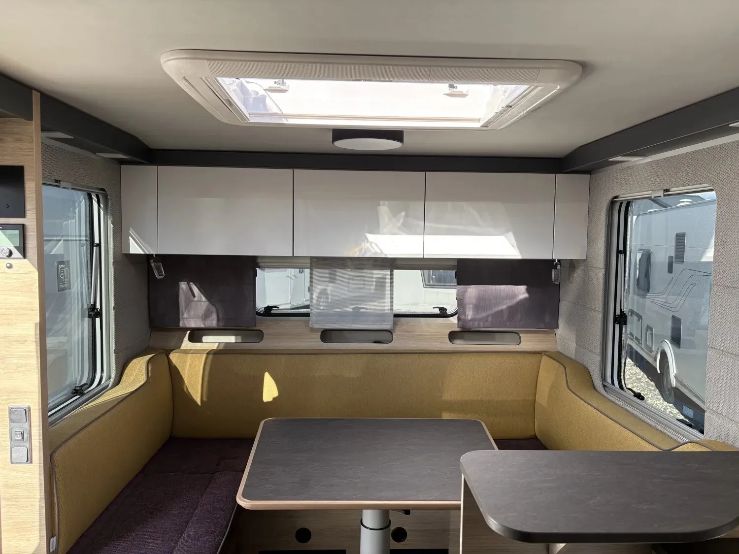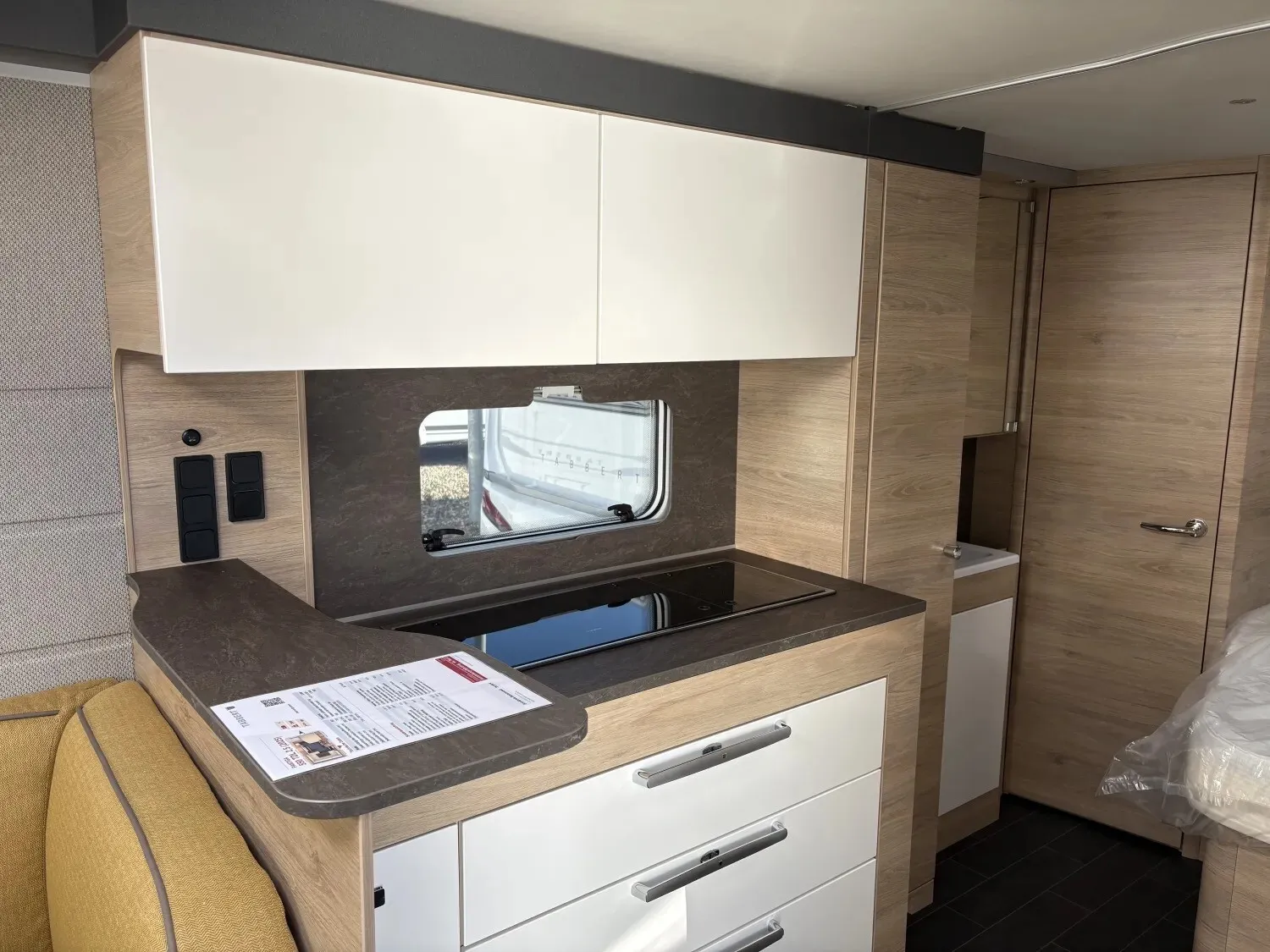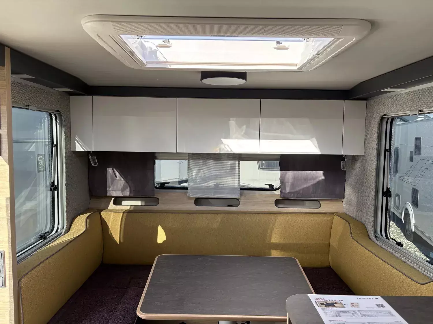 - Premium Interieur-Paket (TABBERT Komfort Schlafsystem mit flexiblem Tellerrost und WaterGEL-Matratze, Insektenschutztür, Deko-Paket Schlafen "PANTIGA": 4 Kissen und 2 Decken im Schlafbereich, Füllstandsanzeige für Frischwassertank)