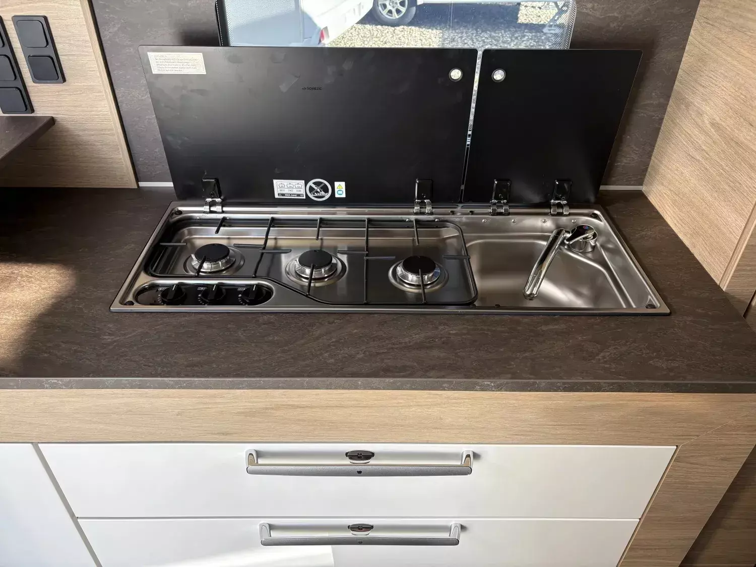 - Kocher-Spülen-Kombination inkl. 3-Flammen-Kocher mit elektrischer Brennerzündung und geteilter Glasabdeckung, fest verbaut