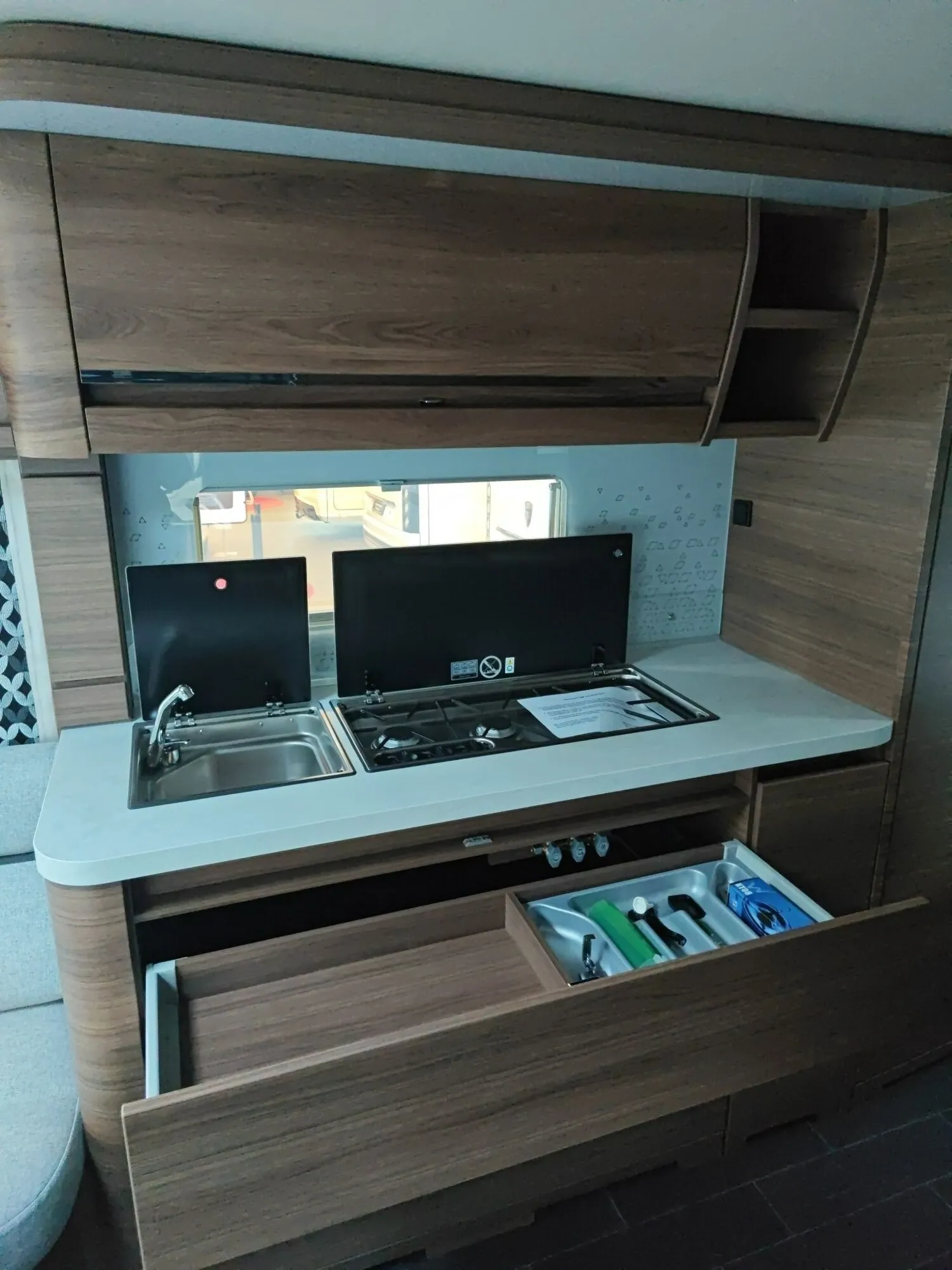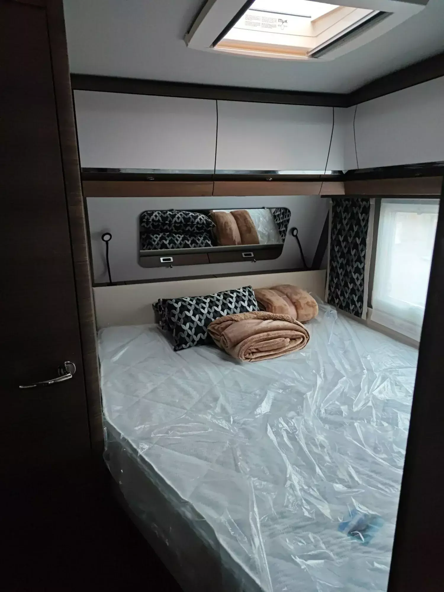 - Premium Interieur-Paket I (Deko-Paket Schlafen: 2 Kissen und 2 Decken im Schlafbereich, TABBERT Komfort Schlafsystem mit flexiblem Tellerrost und WaterGEL-Matratze, Insektenschutztür, Füllstandsanzeige für Frischwassertank)