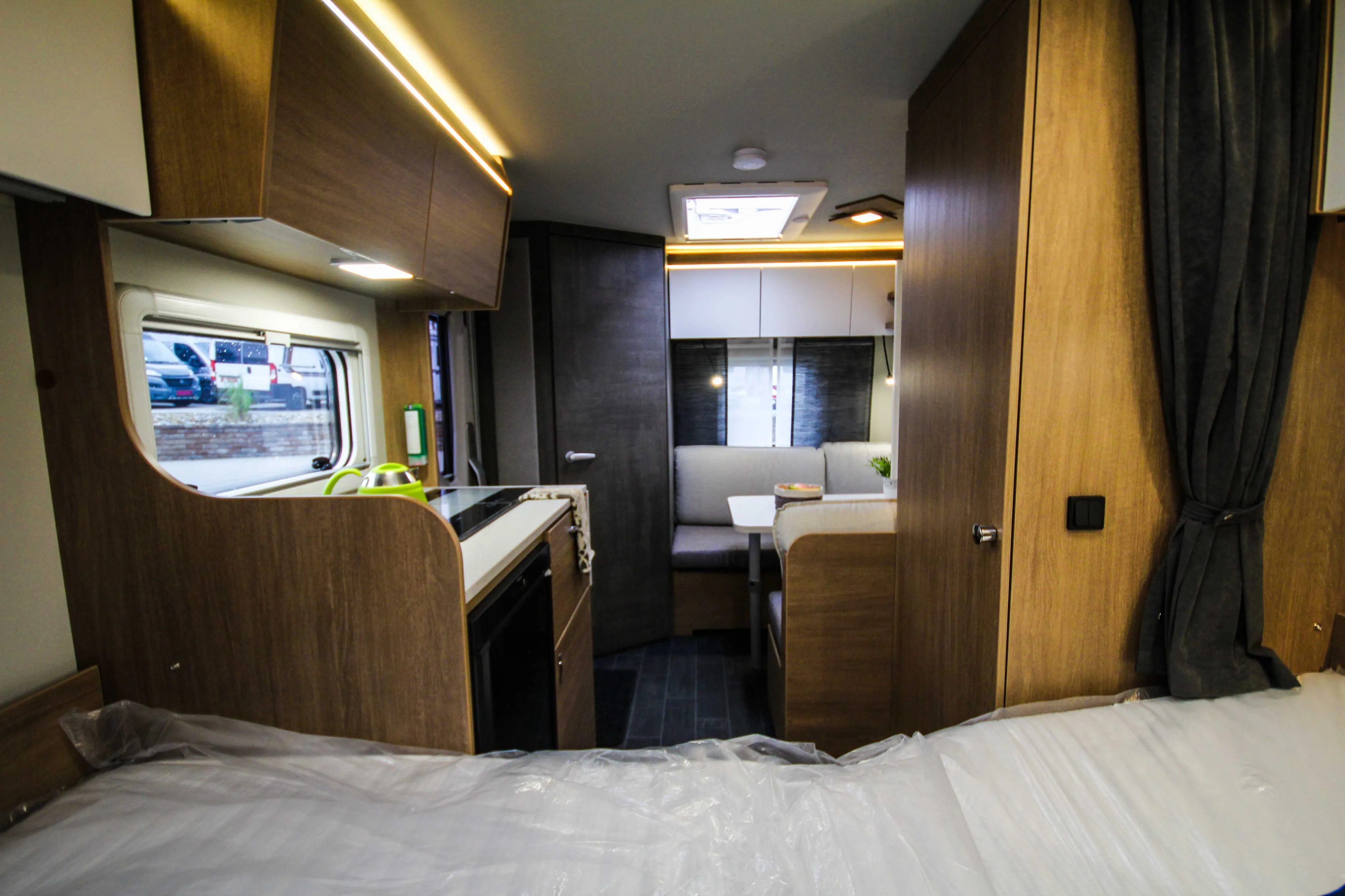 - Premium-Interieur-Paket (Insektenschutztür, Deko-Paket Schlafen "Senara" mit 4 Kissen und 2 Decken im Schlafbereich, TABBERT Komfort Schlafsystem mit flexiblem Tellerrost und WaterGEL-Matratze, Füllstandsanzeige Frischwassertank)