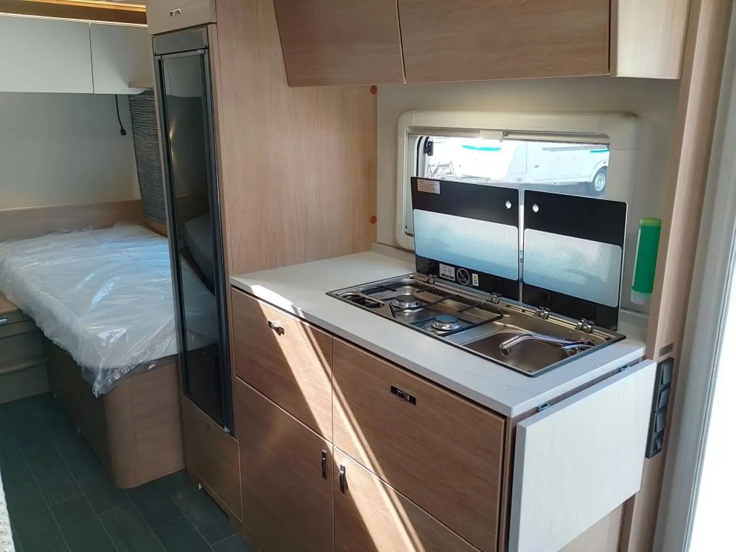 - Premium Interieur-Paket (Deko-Paket Schlafen "PANTIGA": 4 Kissen und 2 Decken im Schlafbereich, TABBERT Komfort Schlafsystem mit flexiblem Tellerrost und WaterGEL-Matratze, Insektenschutztür, Füllstandsanzeige für Frischwassertank)