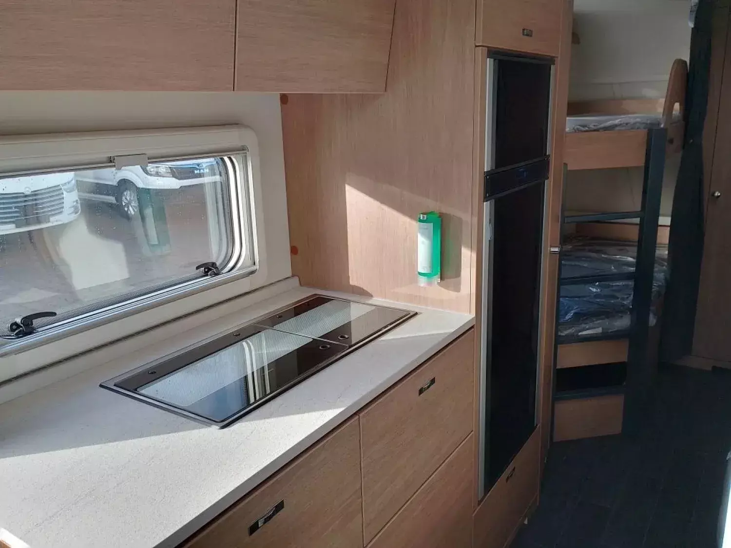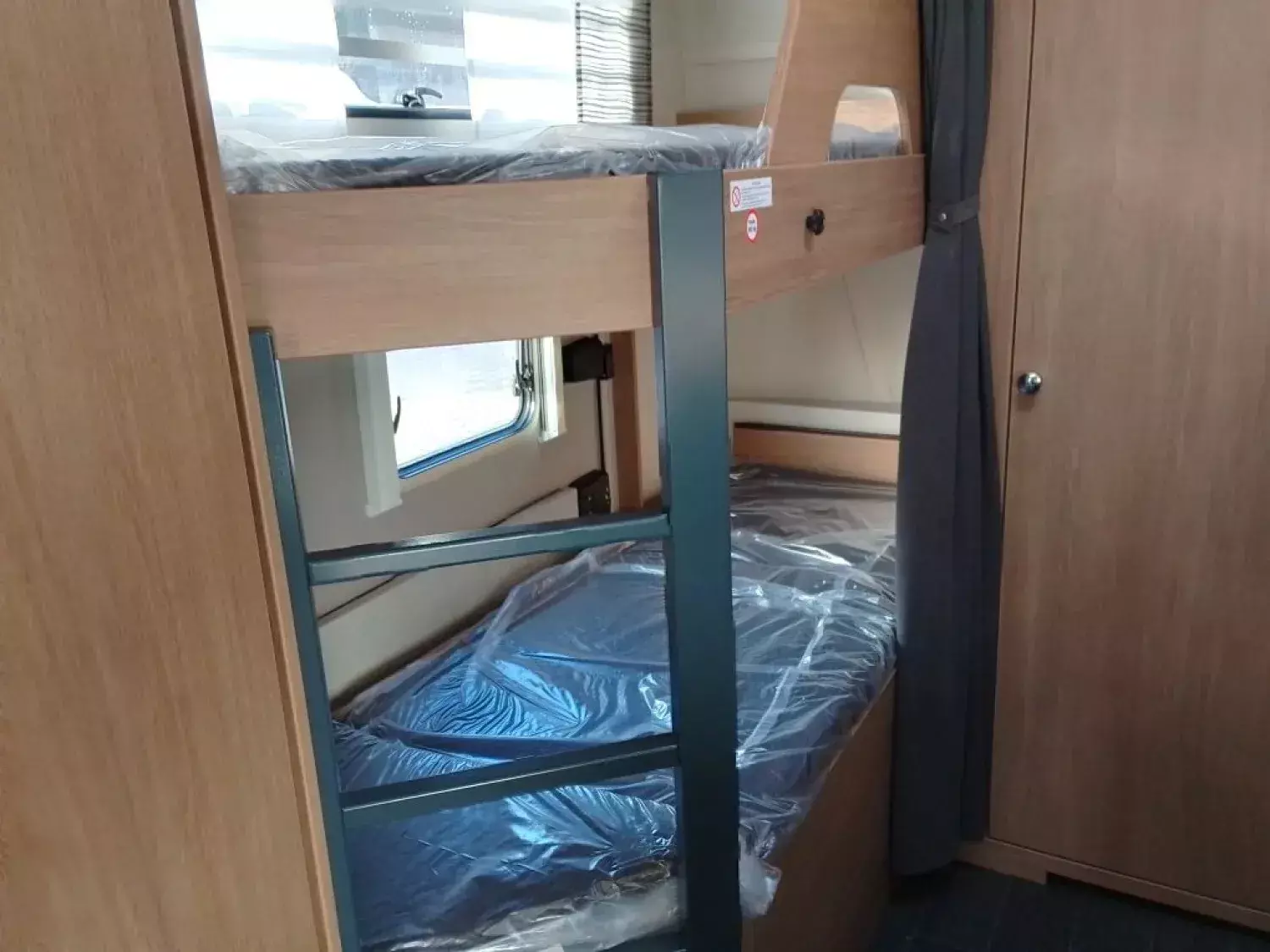 - Etagenbett (2-fach) mit Umbaumöglichkeit unteres Bett zu Sitzgruppe, inkl. Garagentüre 100 x 120 cm, mit Rahmenfenster inkl. Verdunklung und Insektenschutz