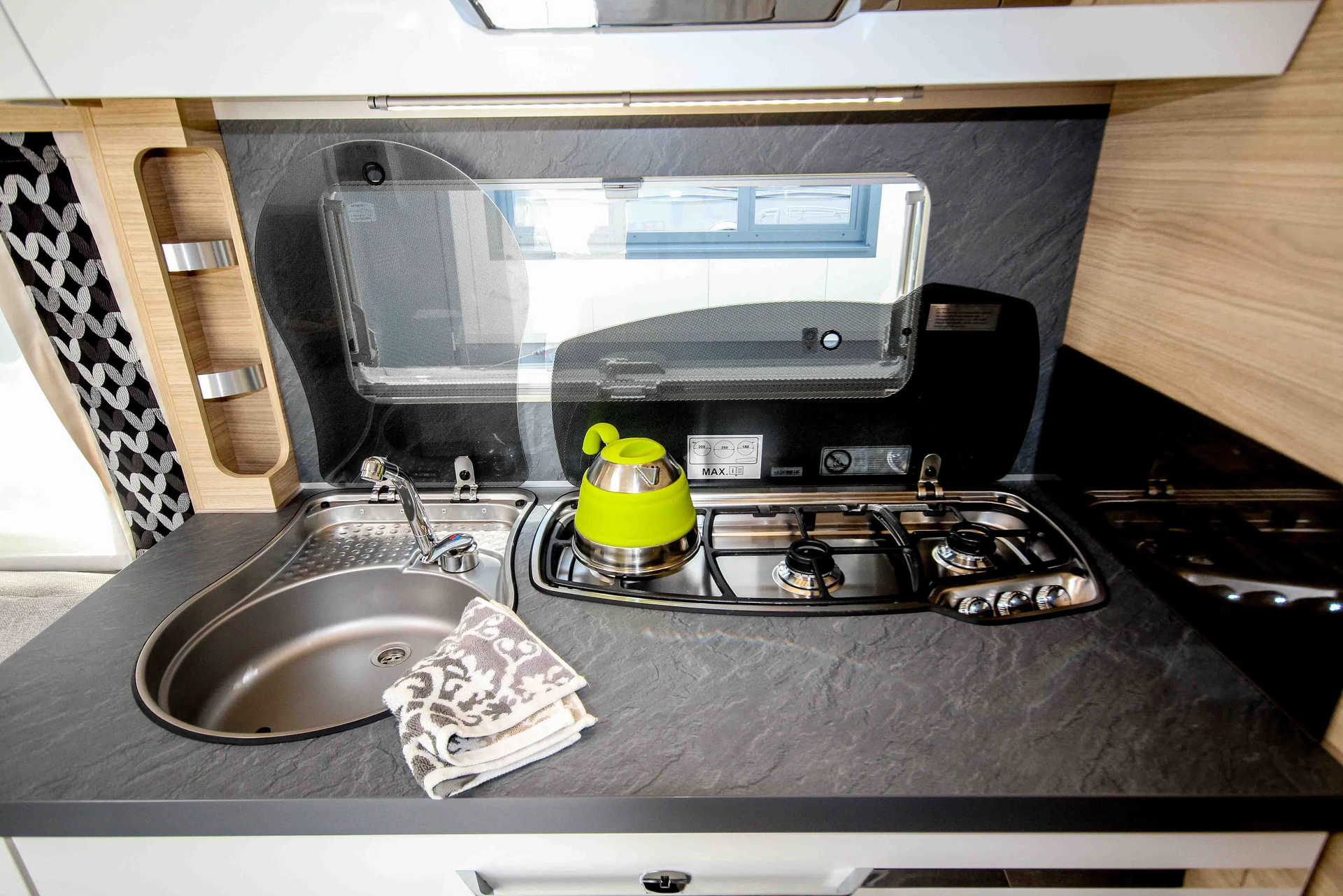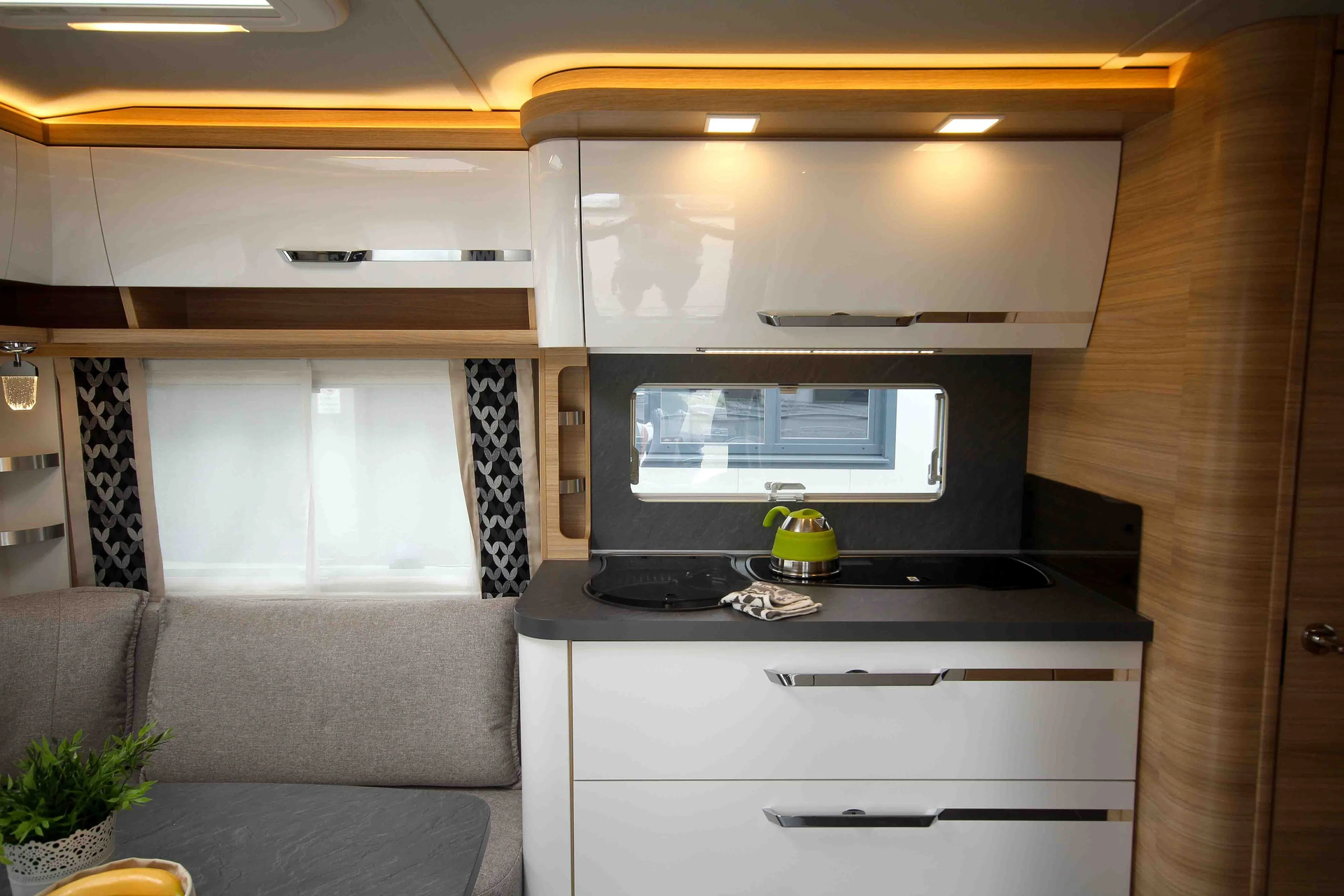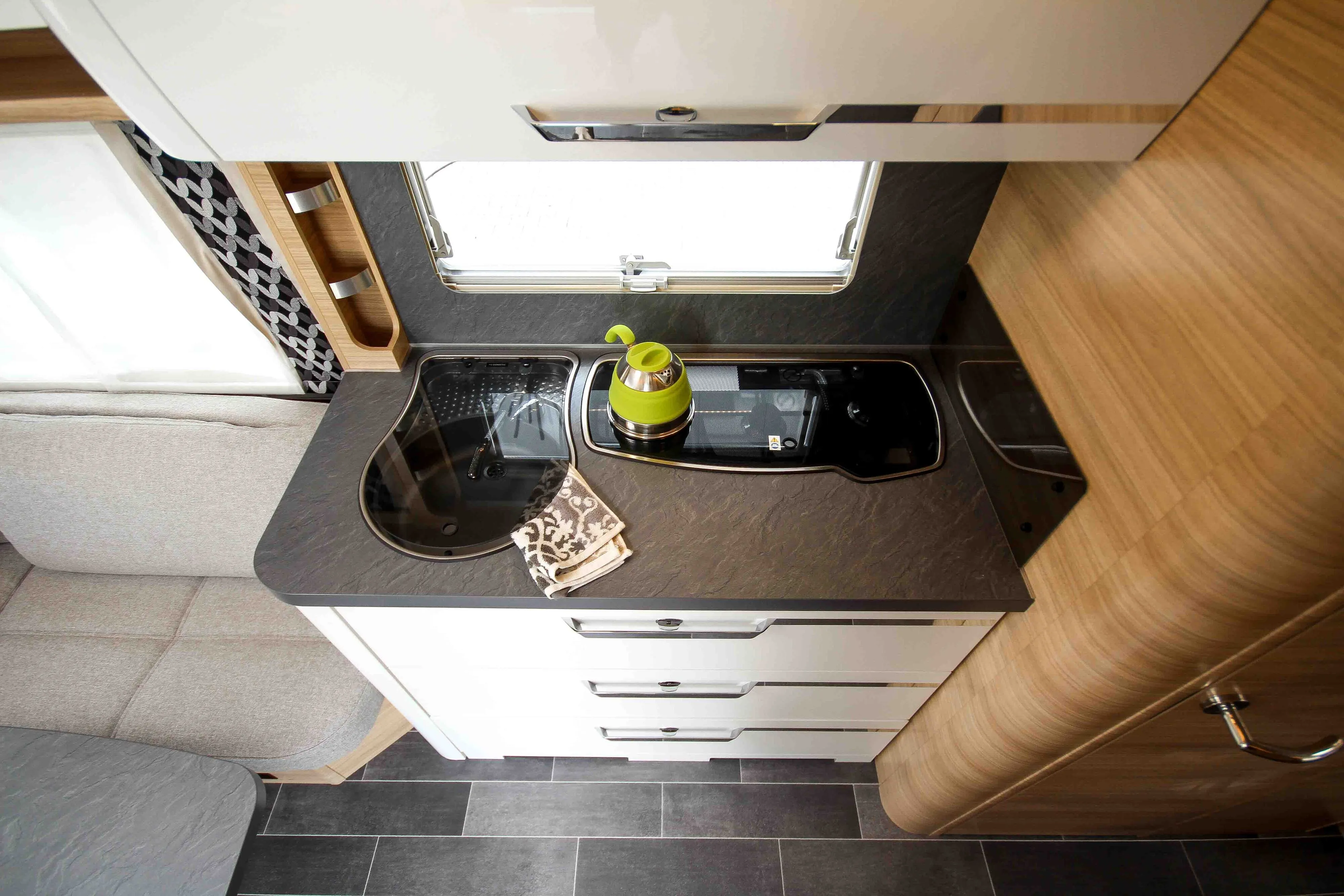 - Premium-Interieur-Paket (Insektenschutztür, Deko-Paket Schlafen: 2 Kissen und 2 Decken im Schlafbereich, TABBERT Komfort Schlafsystem mit flexiblem Tellerrost und WaterGEL-Matratze, Füllstandsanzeige Frischwassertank)