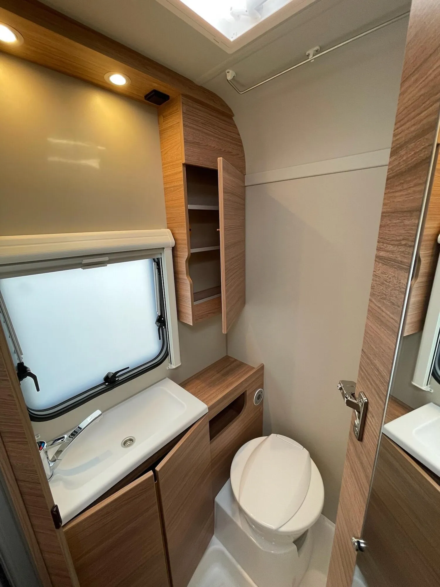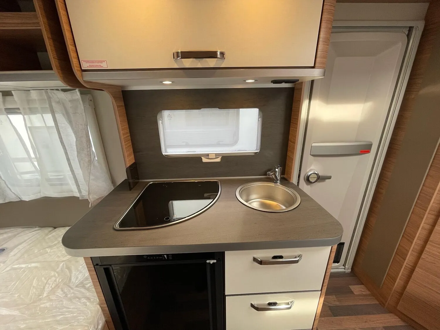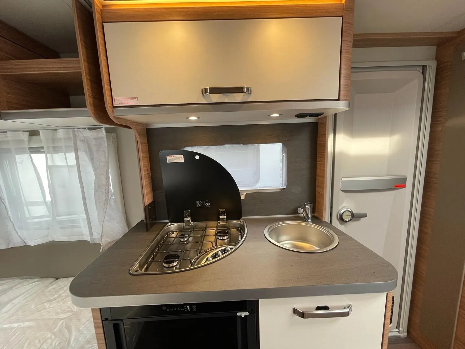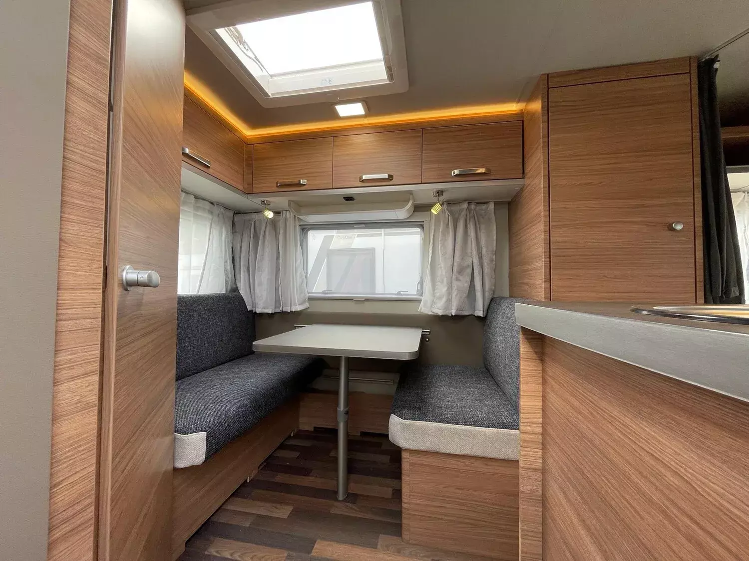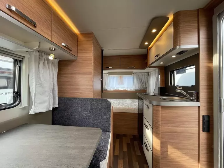 Fahrwerk mit Längslenkerachse, Monoachser, Schwerlastkurbelstützen, Hydraulische Radstoßdämpfer, 5-Loch-Radbefestigung, Rückfahrautomatik, Handbremse servounterstützt, 14" Bereifung, Stahlfelgen, Gaskasten mit Außenklappe und Metallboden, Dachhaube 28 x 28 cm mit Insektenschutz (Toilettenraum), GFK-Dach mit reduzierter Hagelempfindlichkeit, Alu-Hammerschlag an den Seitenwänden (Bug und Heck in Glattblech), Vorzeltleuchte in LED-Technik, Schränke und Staukästen hinterlüftet, Möbeldekor: Salinas Eiche, Vinyl-Bodenbelag, EvoPore HRC Matratze (nur Festbetten), 3-Flammen-Kocher mit Glasabdeckung, Kühlschrank 98 Liter, Kassetten-Toilette DOMETIC drehbar, Gasheizung TRUMA Heizung S 3004