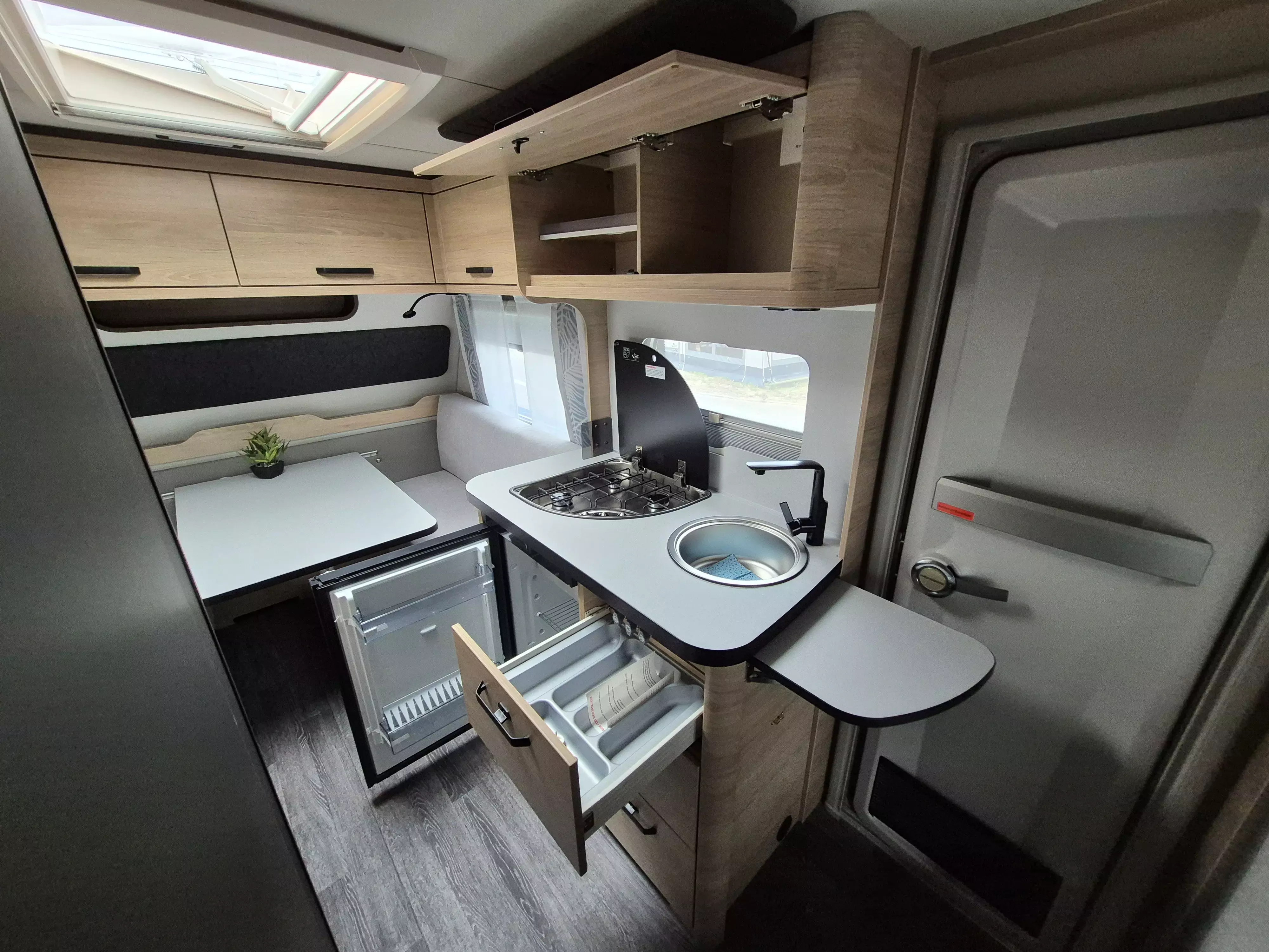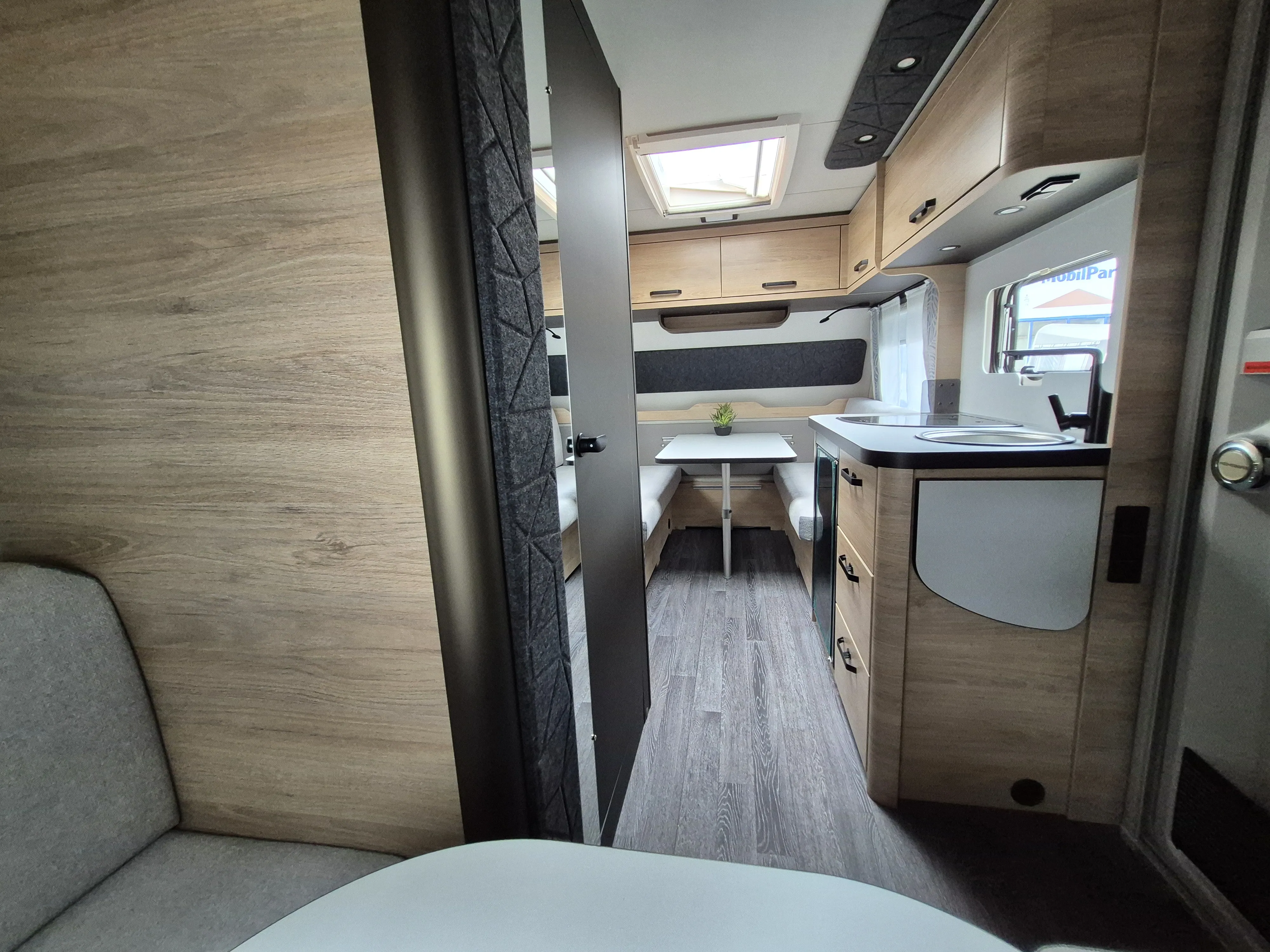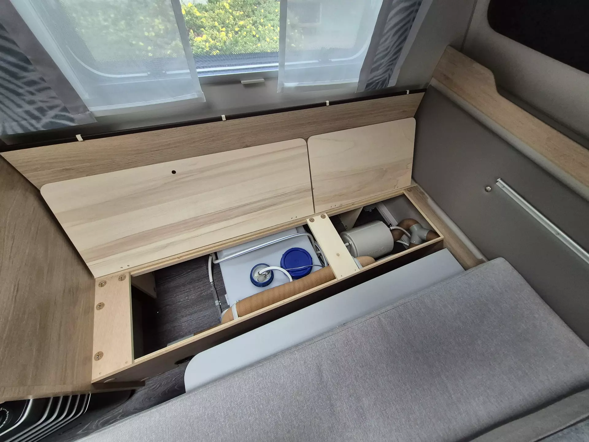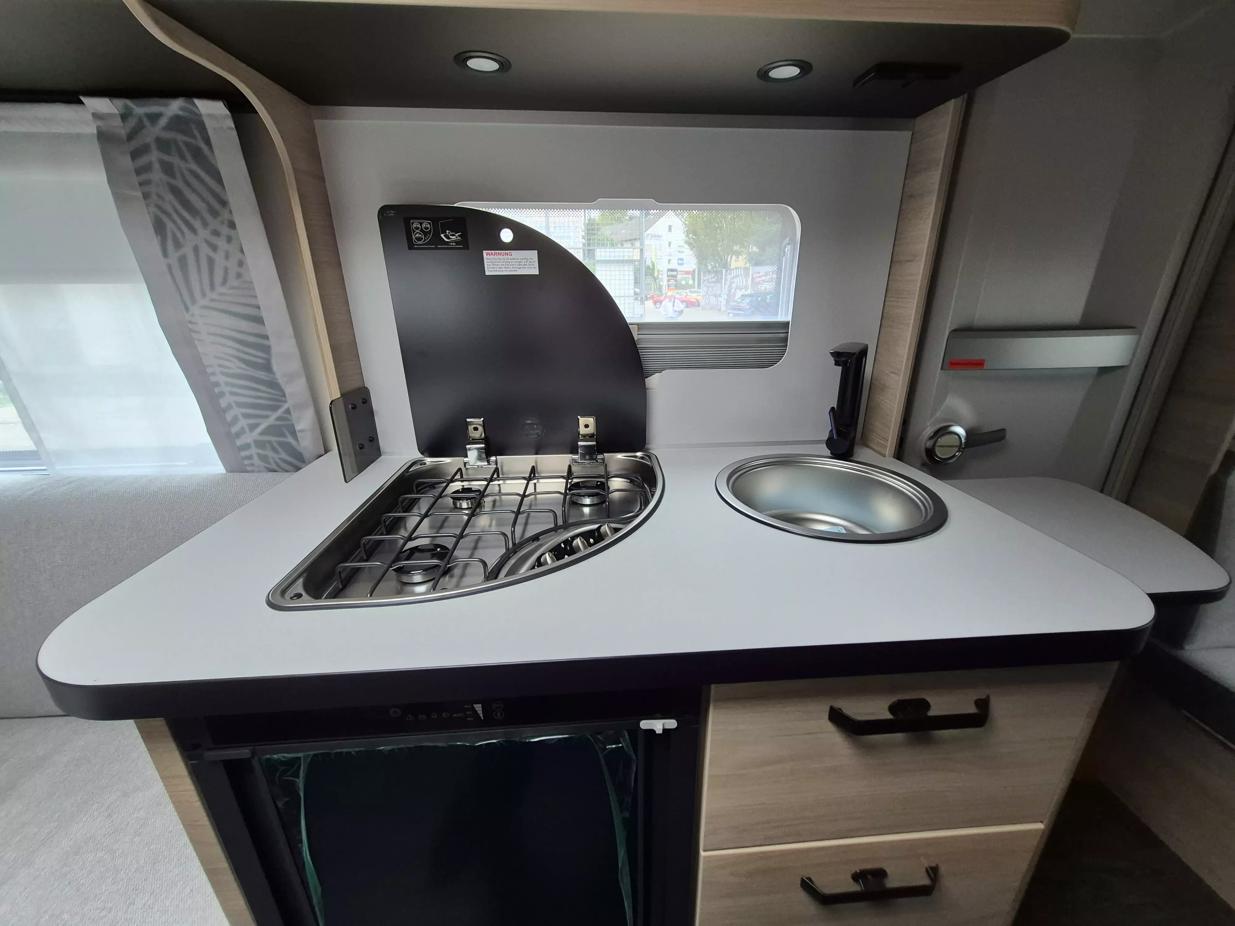 - Smart-Paket (Kombi-Rollos an den Fenstern, inkl. Verdunklung und Insektenschutz, Stabilisator-Sicherheits-Kupplung, Frischwassertank 45 Liter, Festeinbau, Umluftanlage 12 V)