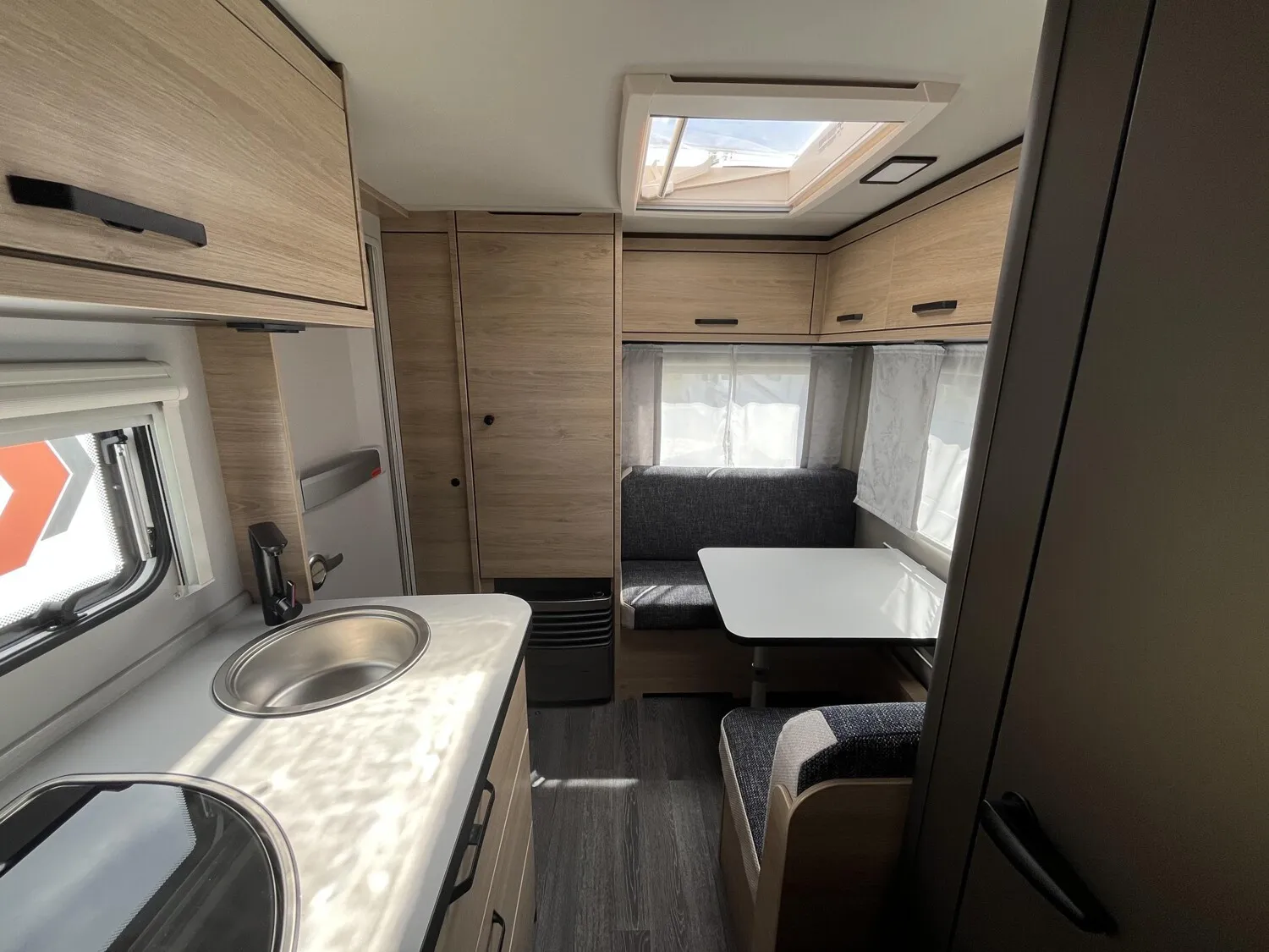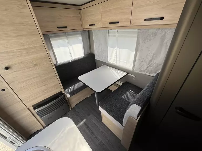 Fahrwerk mit Längslenkerachse, Monoachser, Schwerlastkurbelstützen, Hydraulische Radstoßdämpfer, 5-Loch-Radbefestigung, Rückfahrautomatik, Handbremse servounterstützt, 14" Bereifung, Stahlfelgen, Gaskasten mit Außenklappe und Metallboden, Dachhaube 28 x 28 cm mit Insektenschutz (Toilettenraum), GFK-Dach mit reduzierter Hagelempfindlichkeit, Alu-Hammerschlag an den Seitenwänden (Bug und Heck in Glattblech), Vorzeltleuchte in LED-Technik, Schränke und Staukästen hinterlüftet, Möbeldekor: Salinas Eiche, Vinyl-Bodenbelag, EvoPore HRC Matratze (nur Festbetten), 3-Flammen-Kocher mit Glasabdeckung, Kühlschrank 98 Liter, Kassetten-Toilette DOMETIC drehbar, Gasheizung TRUMA Heizung S 3004