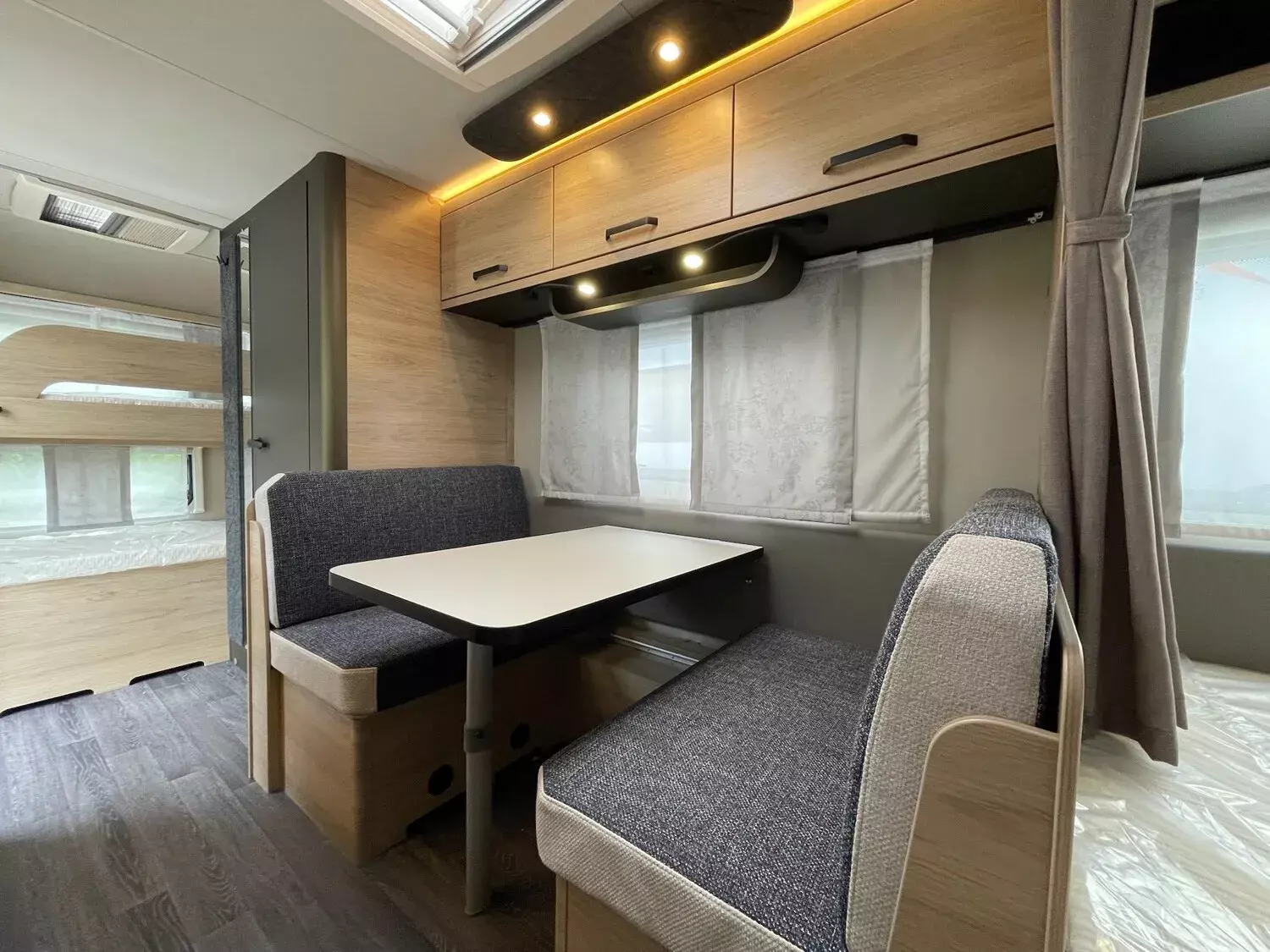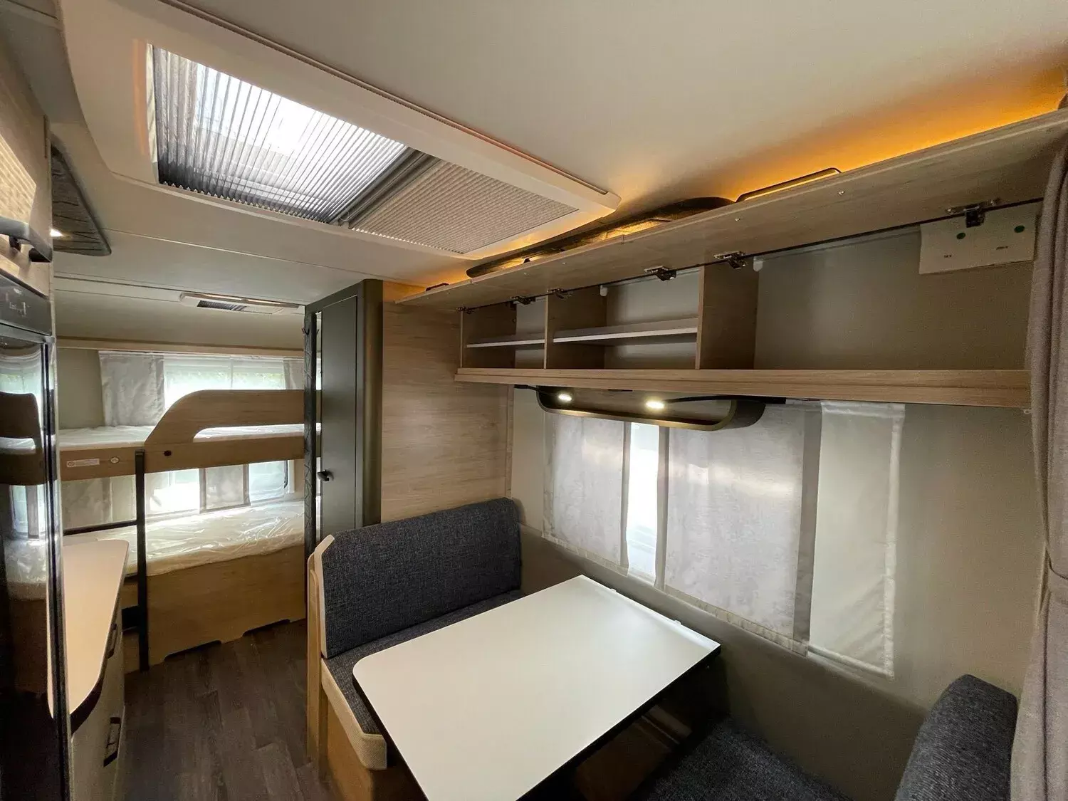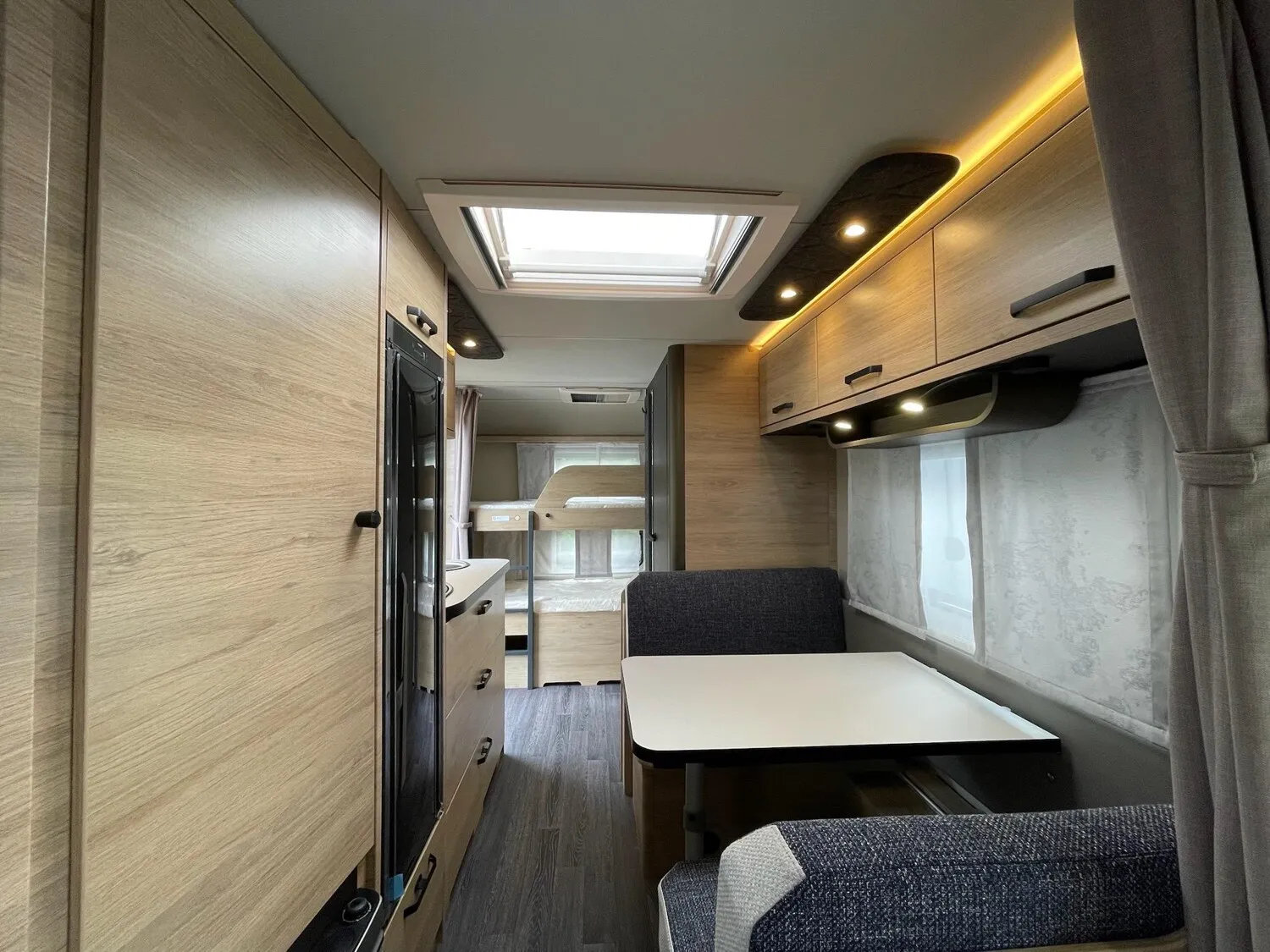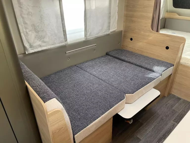 Fahrwerk mit Längslenkerachse, Monoachser, Schwerlastkurbelstützen, Hydraulische Radstoßdämpfer, 5-Loch-Radbefestigung, Rückfahrautomatik, Handbremse servounterstützt, 14" Bereifung, Stahlfelgen, Gaskasten mit Außenklappe und Metallboden, GFK-Dach mit reduzierter Hagelempfindlichkeit, Alu-Hammerschlag an den Seitenwänden (Bug und Heck in Glattblech), Schränke und Staukästen hinterlüftet, Möbeldekor: Salinas Eiche, Vinyl-Bodenbelag, Etagenbett (2-fach), Kühlschrank 133 Liter, Kassetten-Toilette DOMETIC drehbar, Gasheizung TRUMA Heizung S 3004, Leuchte im Schlafbereich bei Etagenbetten inkl. USB-Steckdose