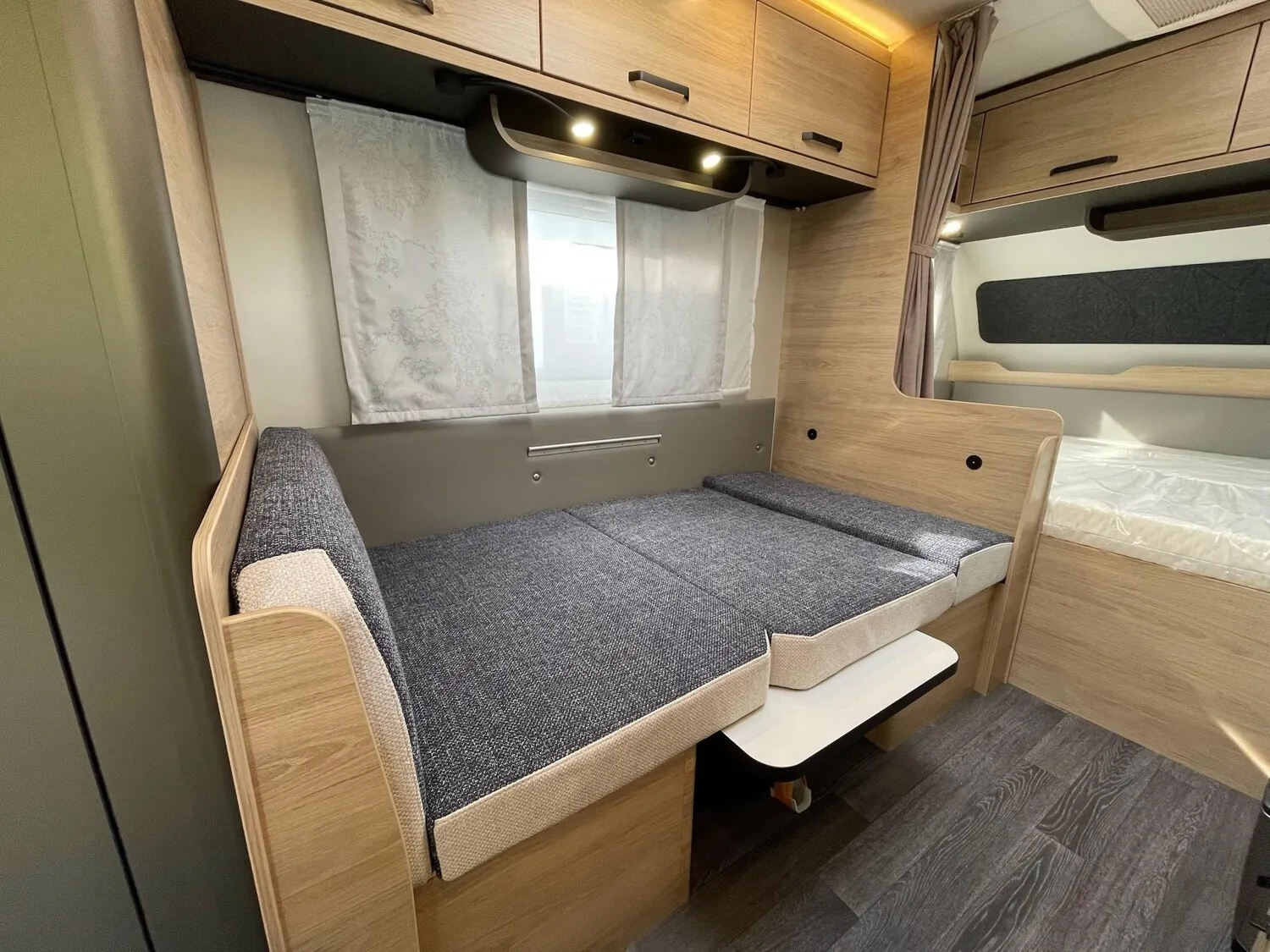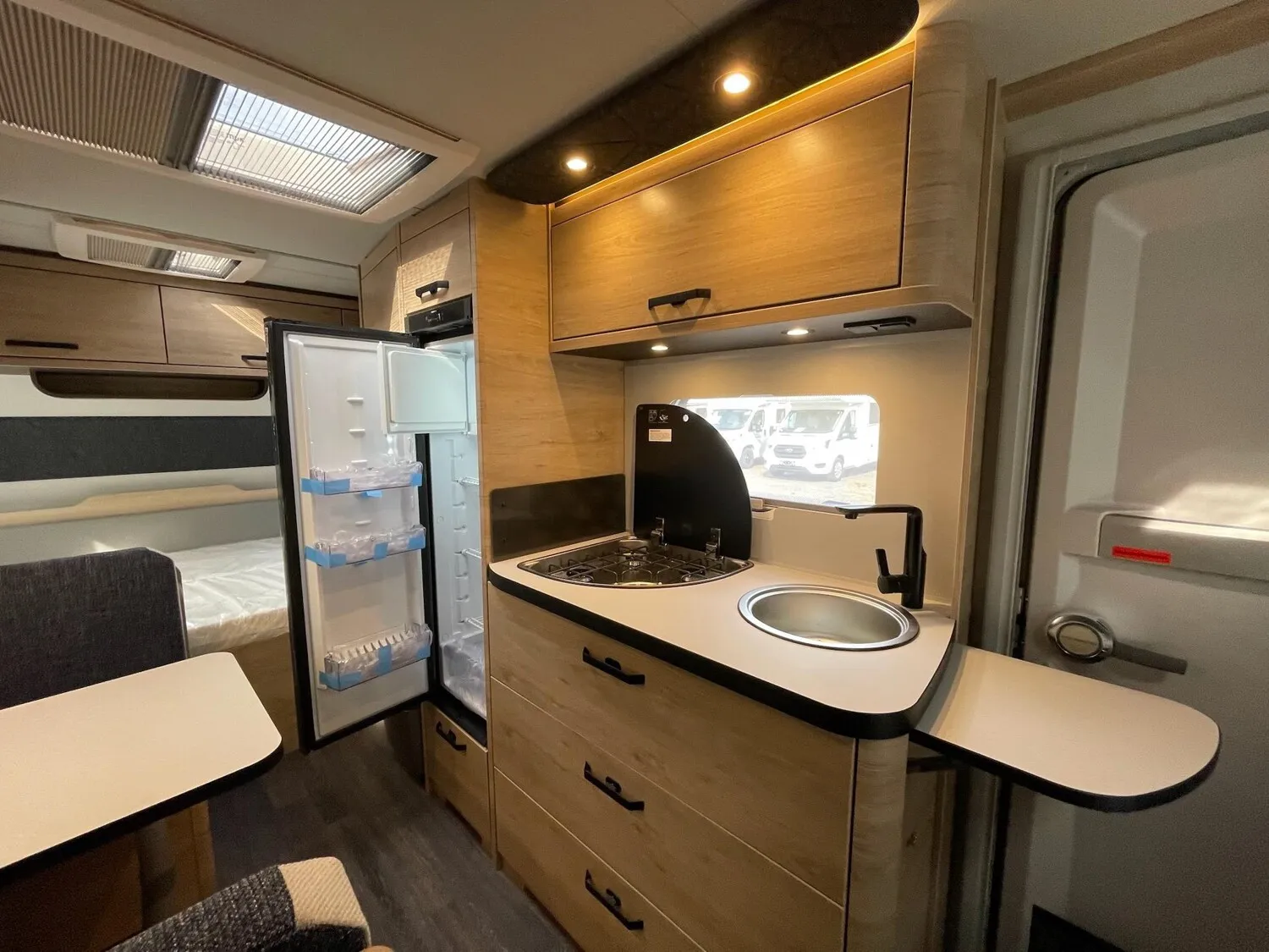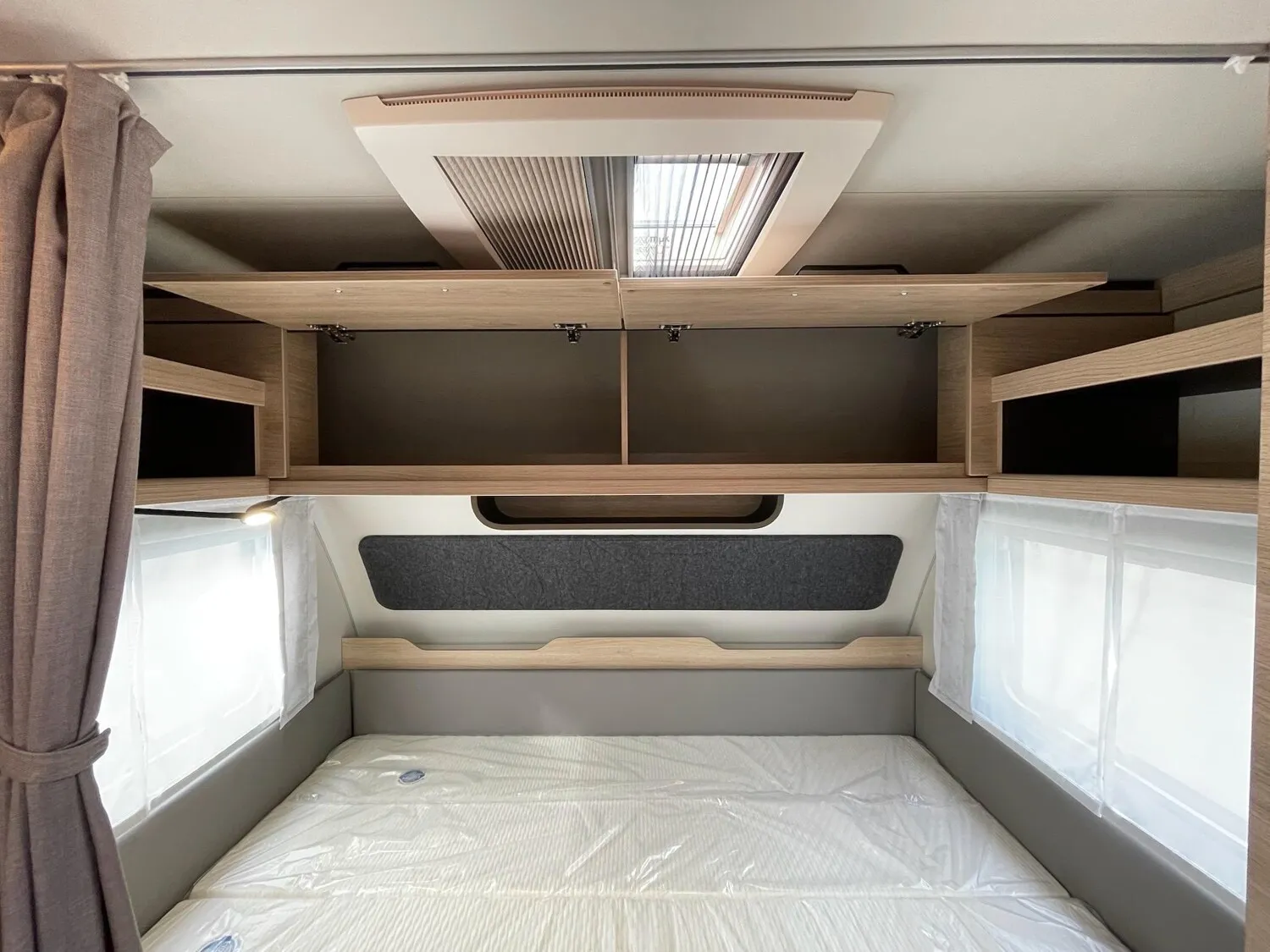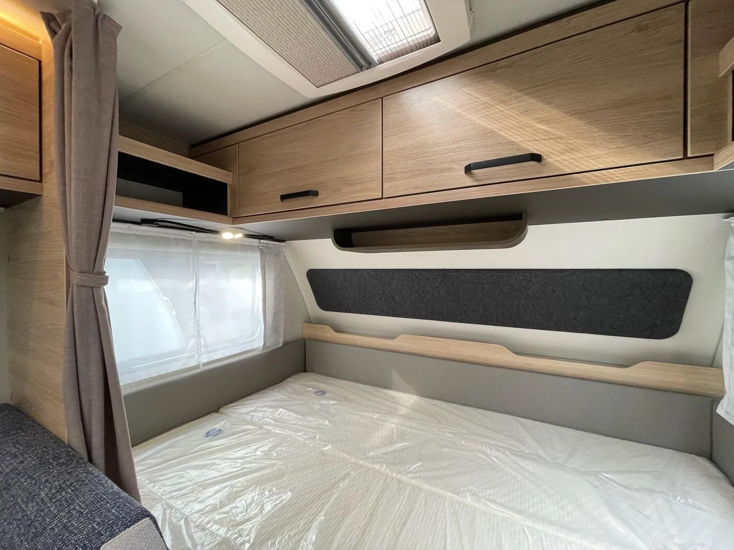 Fahrwerk mit Längslenkerachse, Monoachser, Schwerlastkurbelstützen, Hydraulische Radstoßdämpfer, 5-Loch-Radbefestigung, Rückfahrautomatik, Handbremse servounterstützt, 14" Bereifung, Stahlfelgen, Gaskasten mit Außenklappe und Metallboden, GFK-Dach mit reduzierter Hagelempfindlichkeit, Alu-Hammerschlag an den Seitenwänden (Bug und Heck in Glattblech), Schränke und Staukästen hinterlüftet, Möbeldekor: Salinas Eiche, Vinyl-Bodenbelag, Etagenbett (2-fach), Kühlschrank 133 Liter, Kassetten-Toilette DOMETIC drehbar, Gasheizung TRUMA Heizung S 3004, Leuchte im Schlafbereich bei Etagenbetten inkl. USB-Steckdose