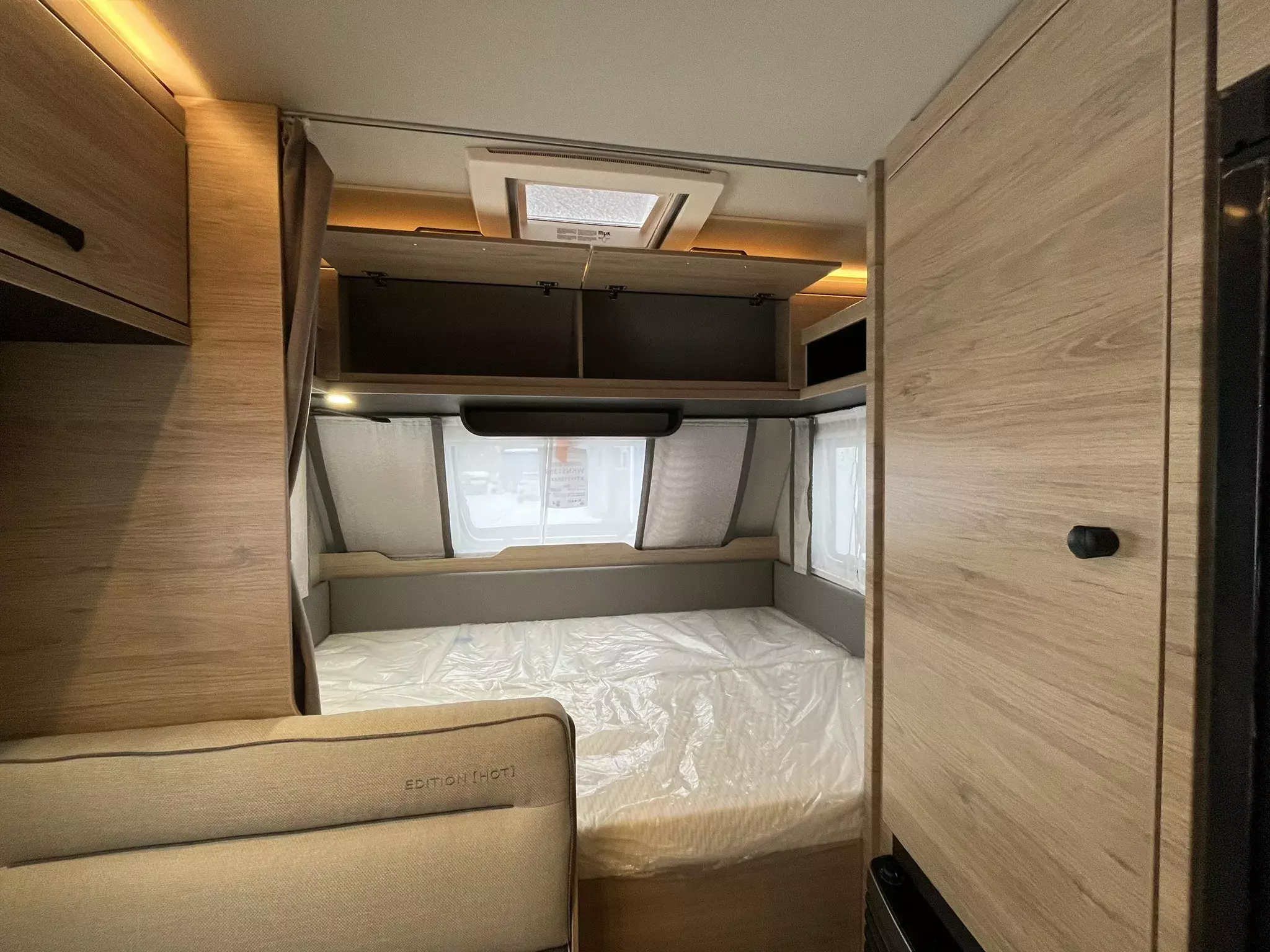 Deichselabdeckung, Serviceklappe 100x40,5 cm Bug rechts, Dachhaube (He-Ki) 70x50cm (Mitte), Insektenschutztuer, Seitenwaende in Glattblech weiss - Mono, Kombi-Rollos an den Fenstern, Ausstellfenster (Bug), Garagentuer 60 x 95 cm rechts, Sonderbeklebung EDITION [HOT], Auflastung auf 1.500 kg, Stabilisator-Sicherheits-Kupplung, Radzierblenden im MARKEN Design, Aufklappbare Arbeitsplattenverlaengerung, TRUMA Therme mit Anschluss fuer Küche, Frischwassertank 45 Liter, Umluftanlage 12 V, Sonderpolster: EDITION [HOT], Stimmungsvolle Ambientebeleuchtung