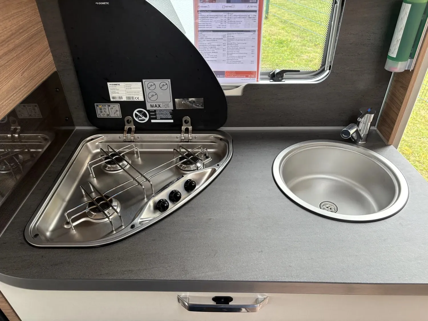 - Advanced-Paket (TRUMA Therme mit Anschluss für Küche und T-Raum (nur 230 V Betrieb), Dachhaube (Hebe-Kipp) 70 x 50 cm, mit Insektenschutz und Verdunklung (Mitte), Abwassertank 25 Liter, rollbar, Duschausbau Waschraum: Brausearmatur mit Halter und Duschvorhang, Insektenschutztür)