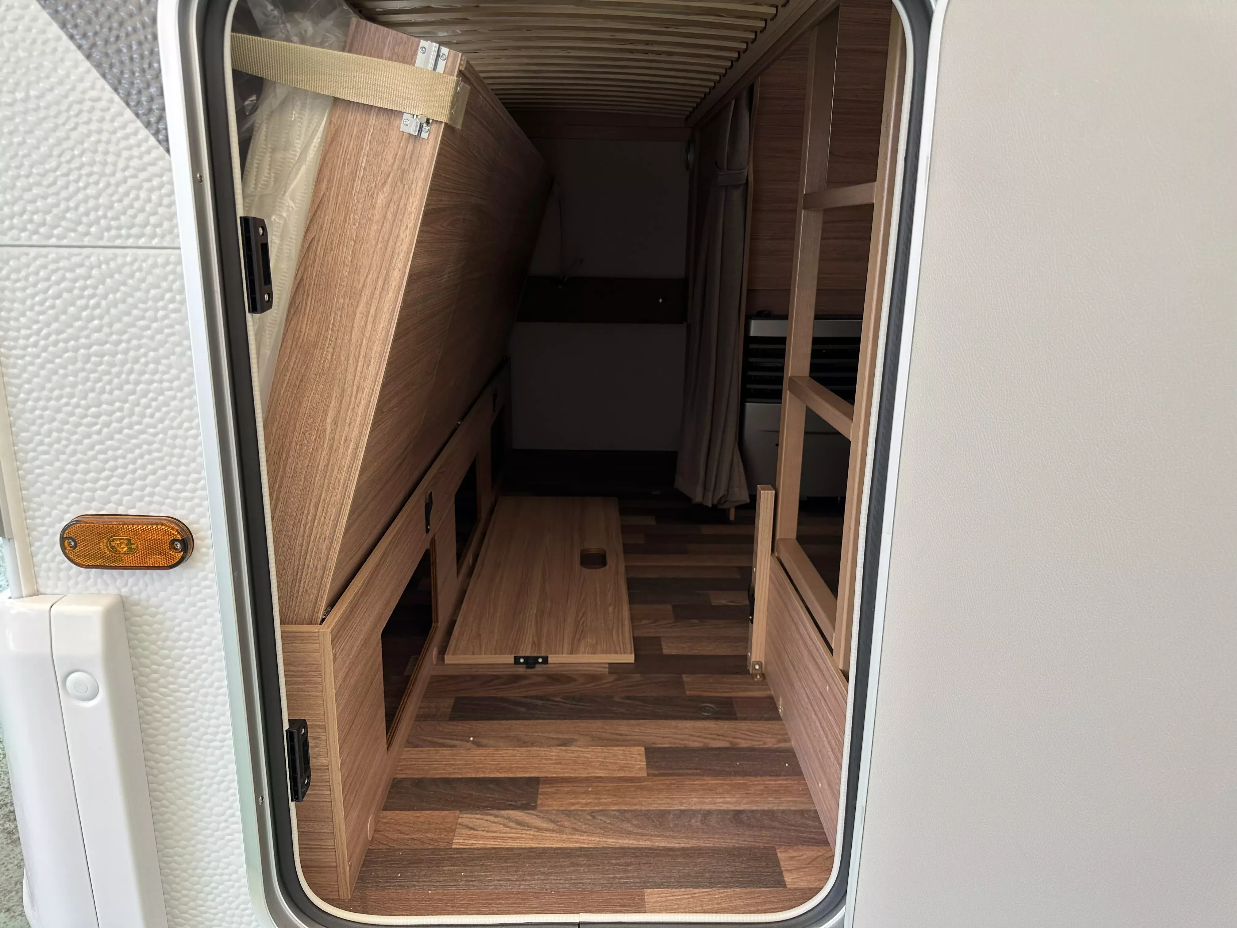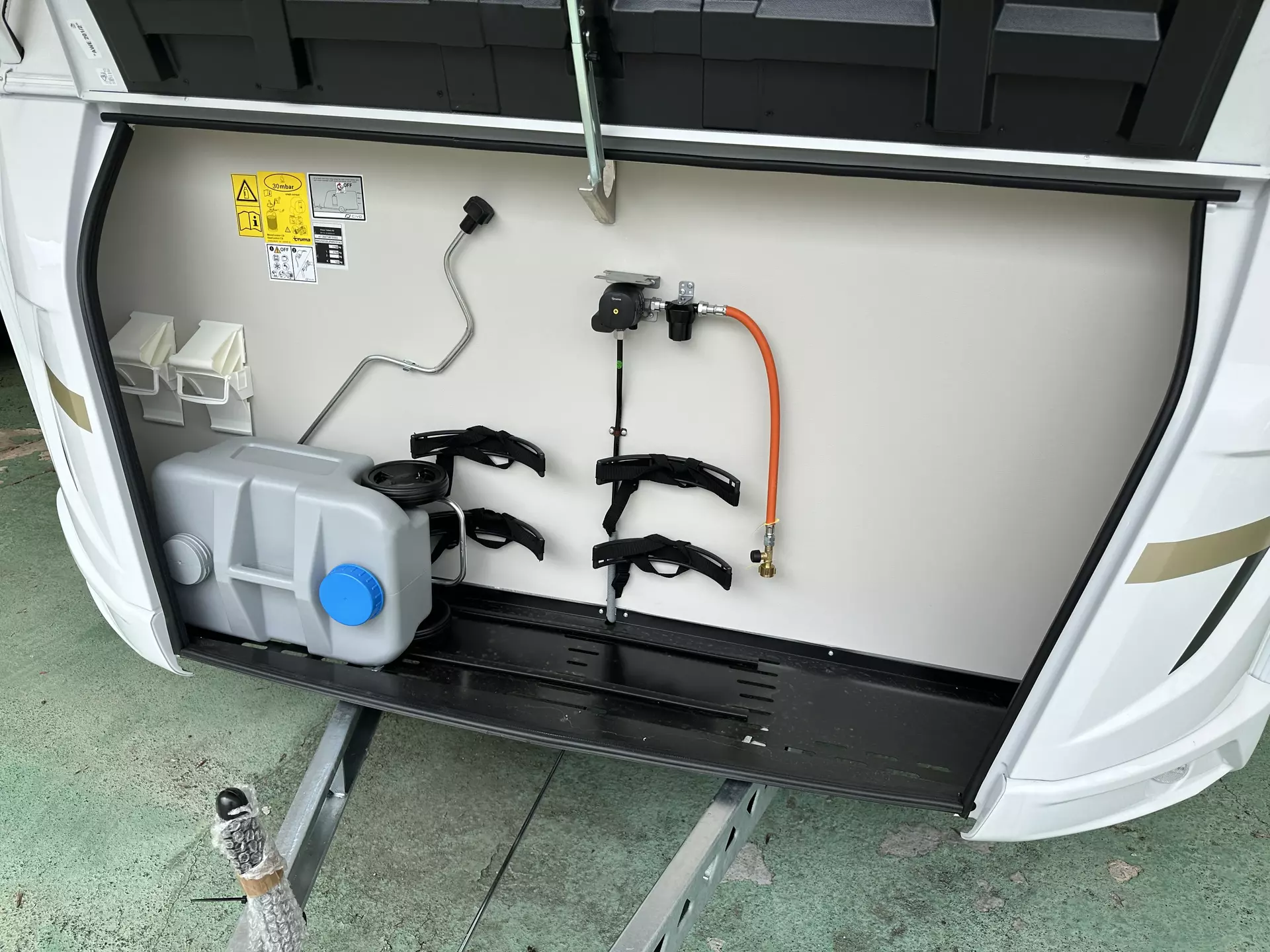 - Advanced-Paket: Dachhaube (Hebe-Kipp) 70 x 50 cm, mit Insektenschutz und Verdunklung (Mitte) / Insektenschutztür / TRUMA Therme mit Anschluss für Küche und T-Raum (nur 230 V Betrieb) / Abwassertank 25 Liter, rollbar / Duschausbau Waschraum: Brausearmatur mit Halter und Duschvorhang