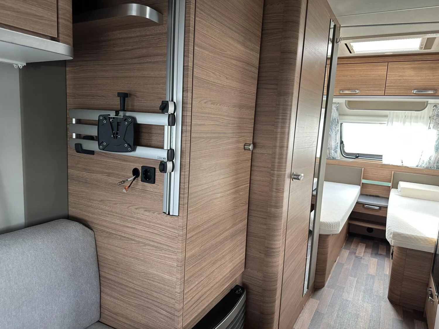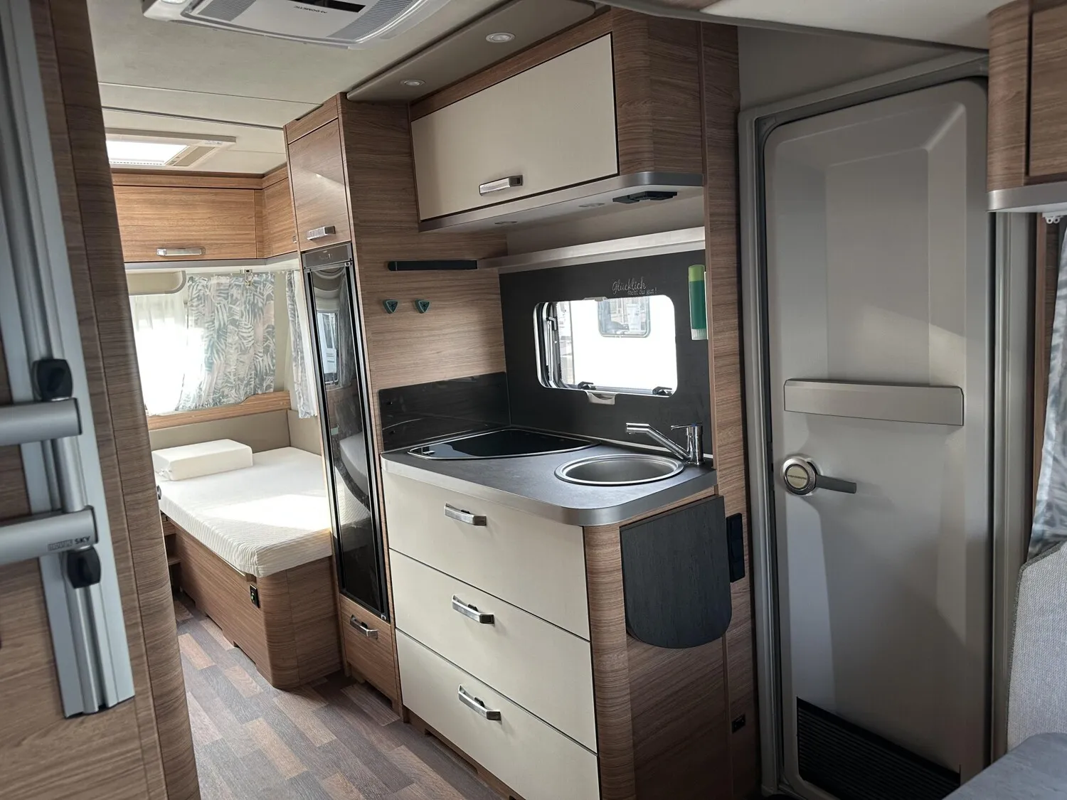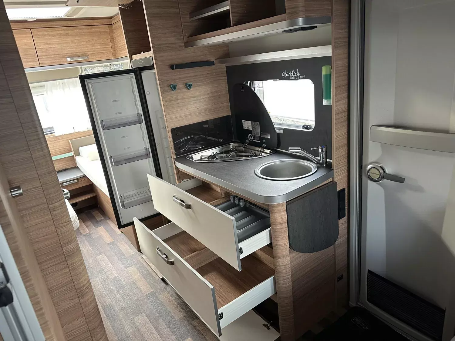 - Smart-Paket (Seifen- und Spülmittelspender, Wasserfiltersystem "bluuwater", Frischwassertank 45 Liter, Festeinbau, Schwerlastkurbelstützen, Stabilisator-Sicherheits-Kupplung, Umluftanlage 12 V, Kombi-Rollos an den Fenstern, inkl. Verdunklung und Insektenschutz)