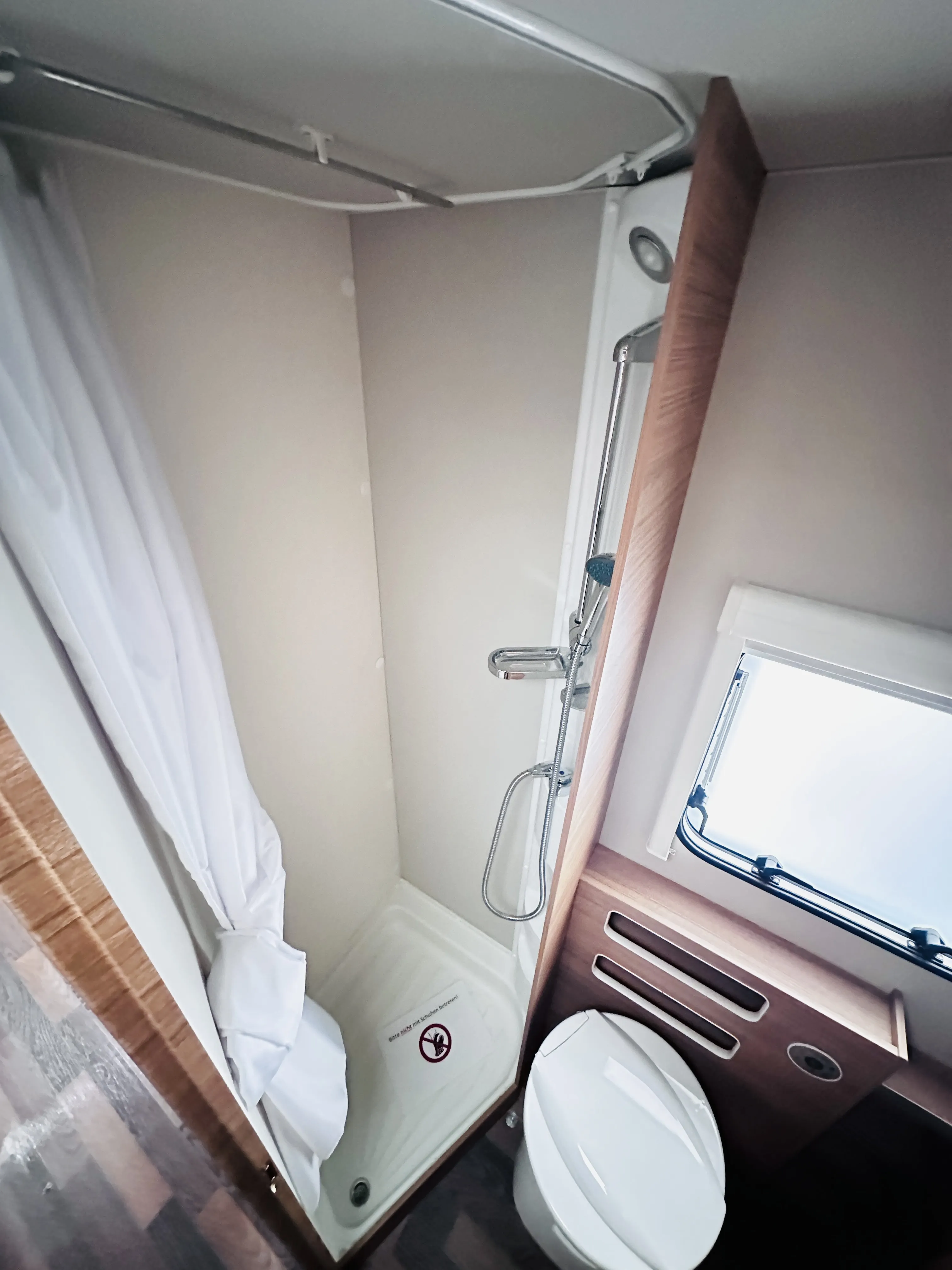 Duschausbau Waschraum: Brausearmatur mit Halter und Duschvorhang