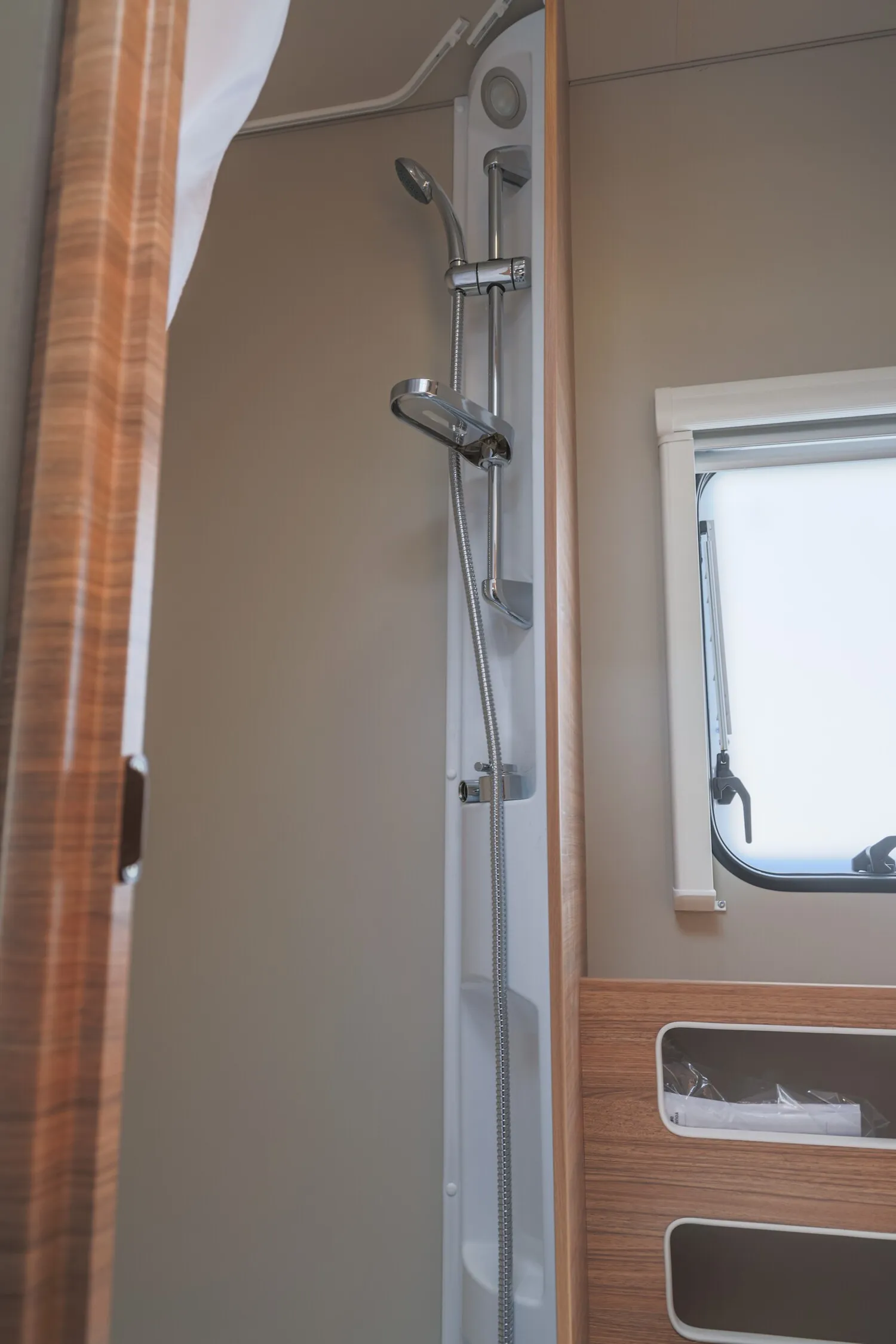 - Duschausbau Waschraum: Brausearmatur mit Halter und Duschvorhang