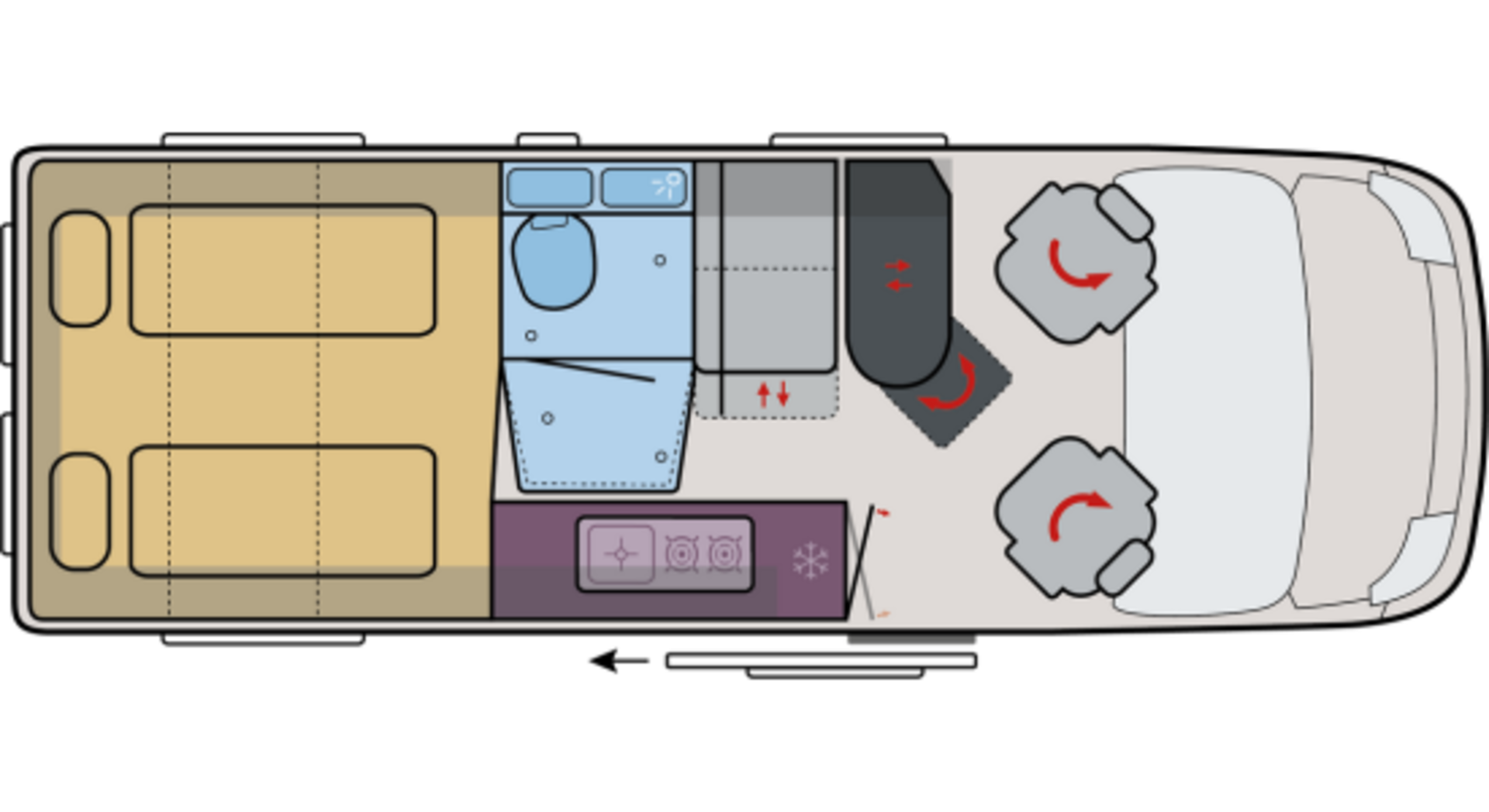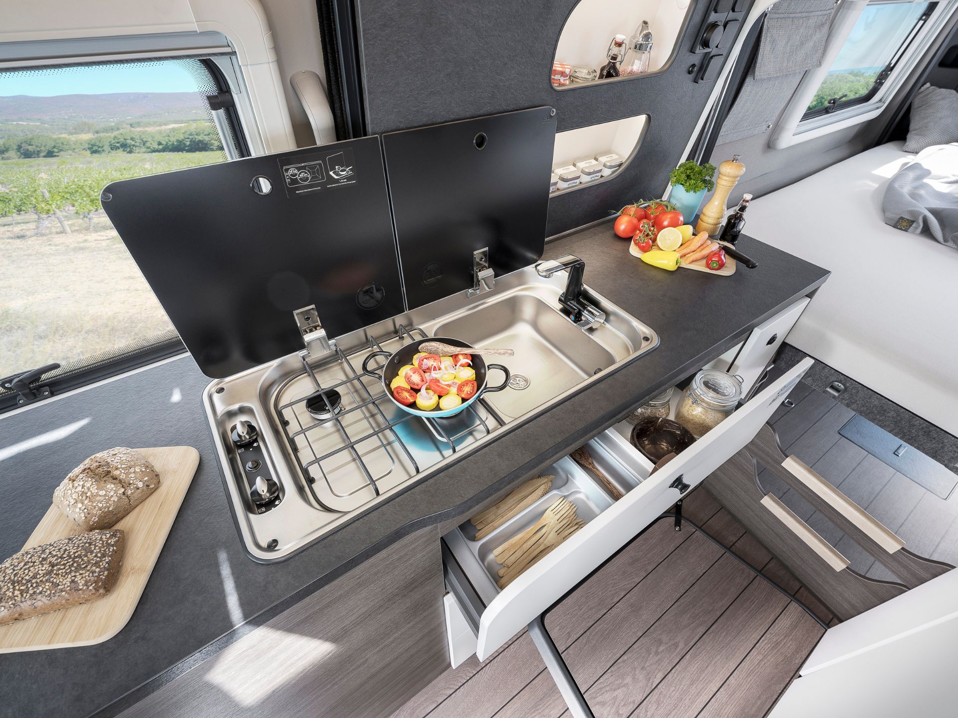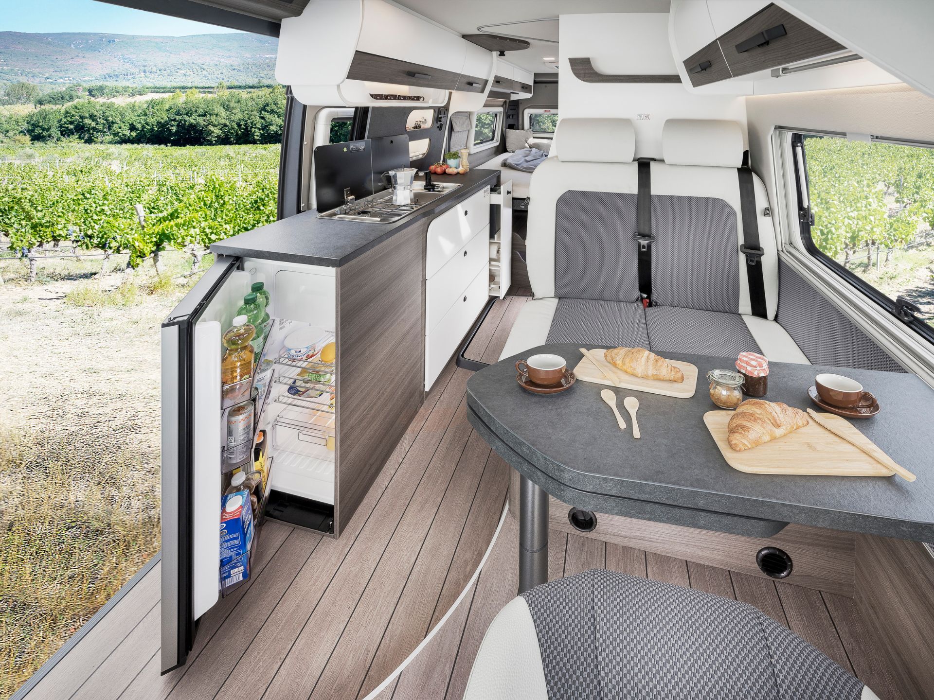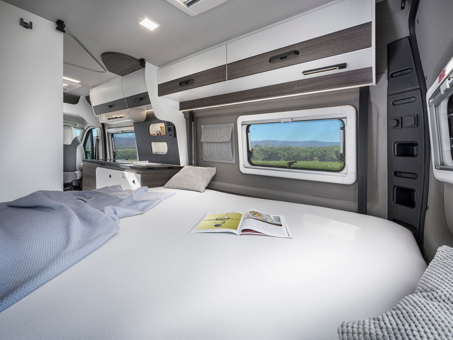 Nebelscheinwerfer mit Abbiegelicht, Lackierter Stoßfänger vorne, Skid plate schwarz / Spoilerlippe (nur light Chassis), LED-Leseleuchten über Fahrer- und Beifahrersitz, Regenrinne über der Schiebetür mit LED Beleuchtung, Ambientebeleuchtung (dimmbar)